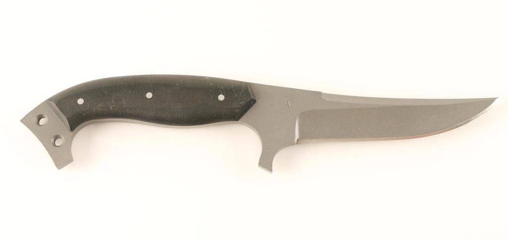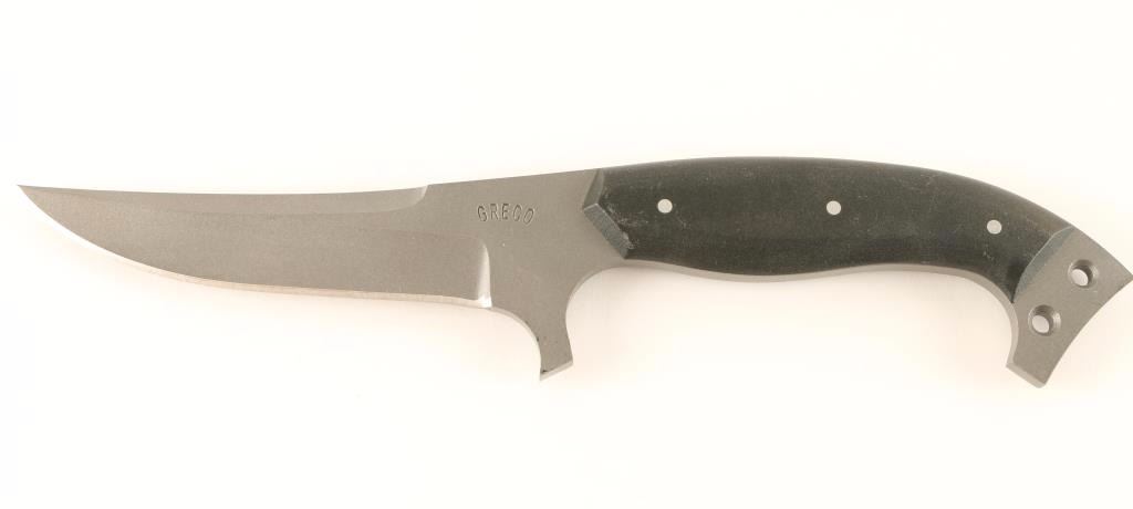 Greco knife with black composite handle and coated stainless steel blade with finger groove. Measures 10 1/4" overalll with a 5" blade.