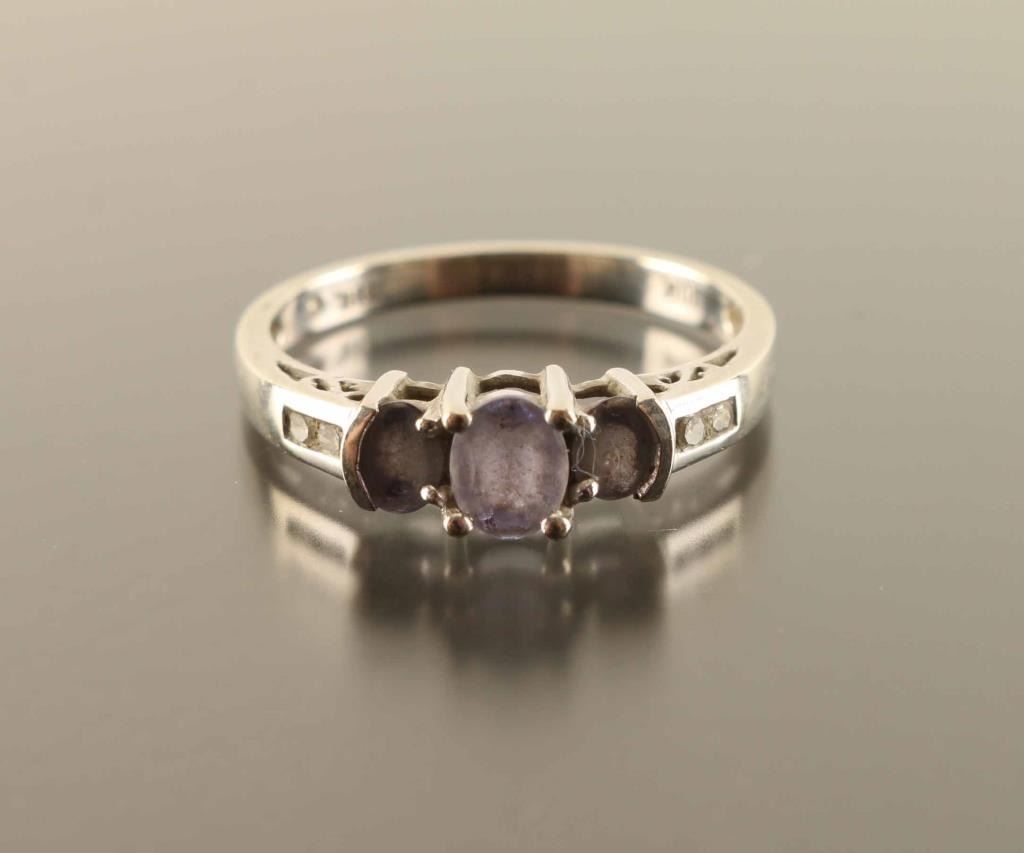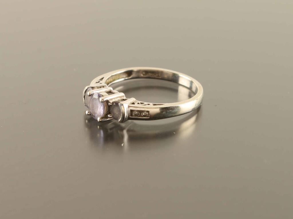 This 10k white gold ring features .45 carats of round tanzanites and diamonds in a classic 3 stone setting. The diamonds weigh .o5 carats altogether and there are two set on either side of the center stones in a small channel setting. Filigree work on the sides of the ring accent these. The ring weighs 2.2 grams.