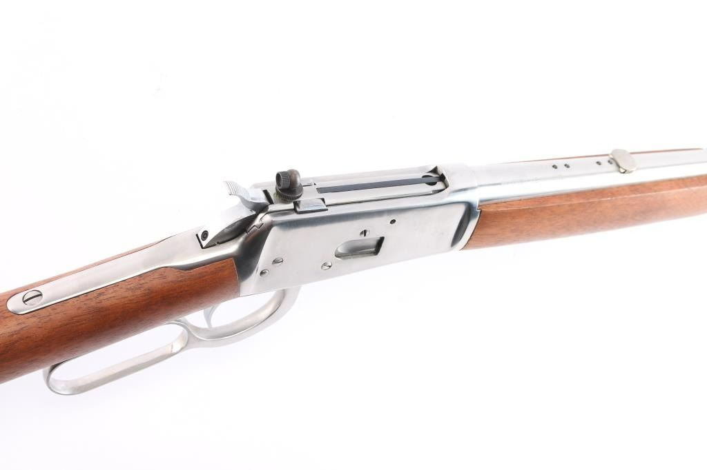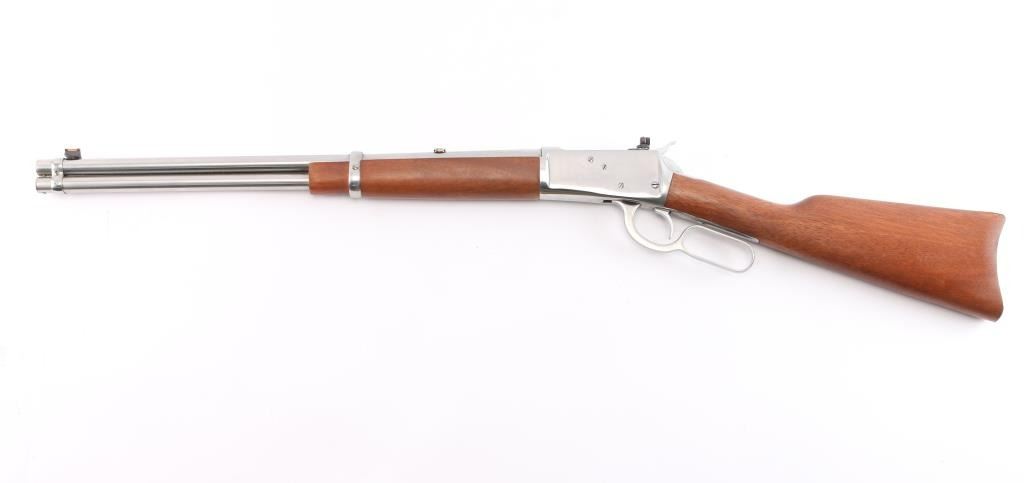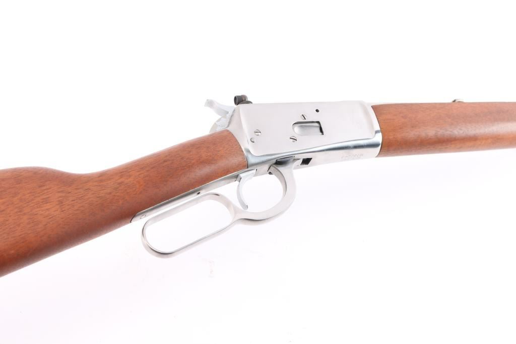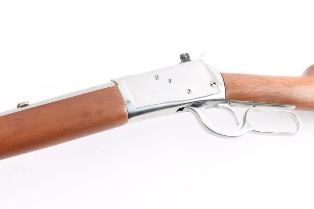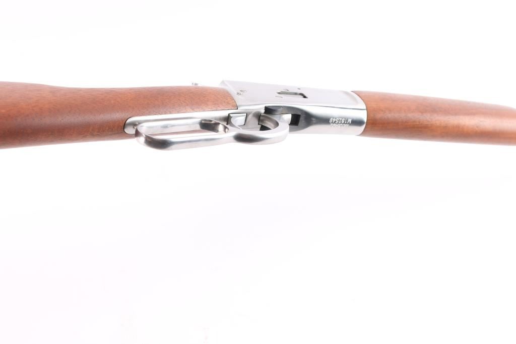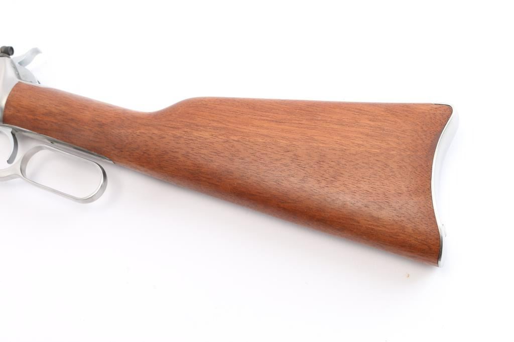 SN: #M182549. Lever action repeating rifle modeled after the Winchester 1892, chambered in .44 Magnum, made in Brazil by Taurus. Imported by Braztech of Miami, F.L. with import marks on the right side of the barrel. Features stainless steel construction, 20" barrel with a dovetailed raised red fiber optic dot/blade front sight and a bolt mounted peep rear sight, full-length tube magazine, two barrel bands, smooth trigger, serrated hammer spur, smooth hardwood fore end and straight grip shoulder stock with curved metal buttplate. Bore is pristine. Retains 98% finish with faint handling marks. Wood is excellent, action is smooth. Comes with factory box. NRA Condition is Excellent - like new. ***Modern Firearm***.