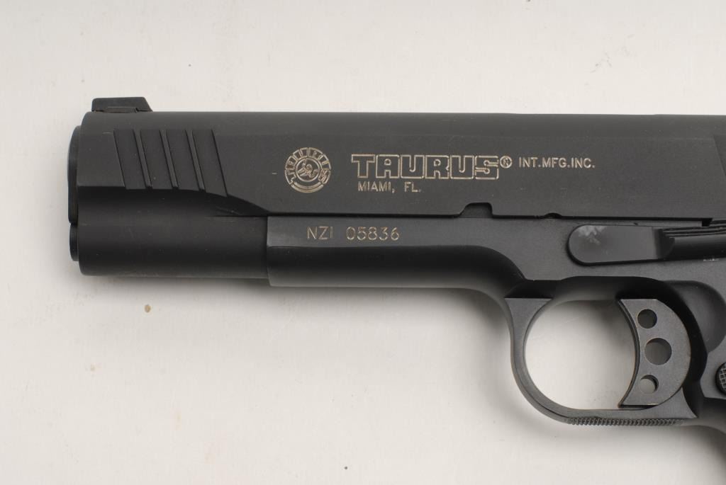 Taurus Model PT 1911 semi-automatic pistol, .45 caliber, 5” barrel, S/N NZ105836, mat black finish, checkered black grips in overall excellent condition showing little if any use, crisp action, sharp markings and fine bore.(Modern/PPT). Est.: $300-$600.