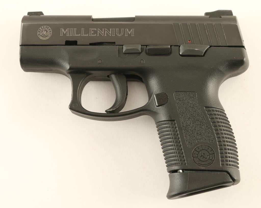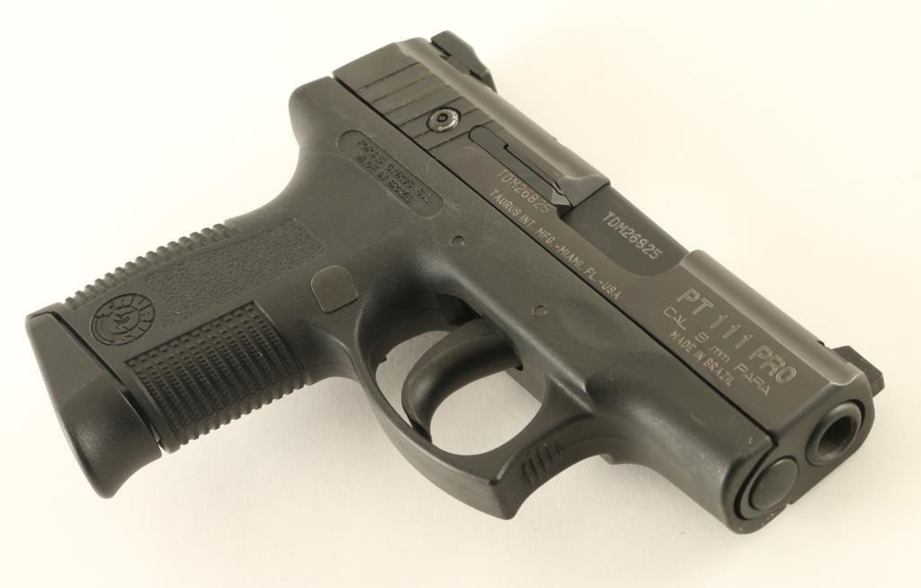 Brazilian semiautomatic pistol imported by Taurus INT, Miami FL. Features approx 3.25" barrel, fixed dovetail mounted sights, striker fired with double action only trigger, frame mounted manual safety. Bore is good condition, bright with strong rifling, needs cleaning. Retains 90% black finish with bare metal showing on some sharp edges. Black polymer frame is very good condition. Includes one magazine. Condition is NRA Very Good *** Modern Firearm ***