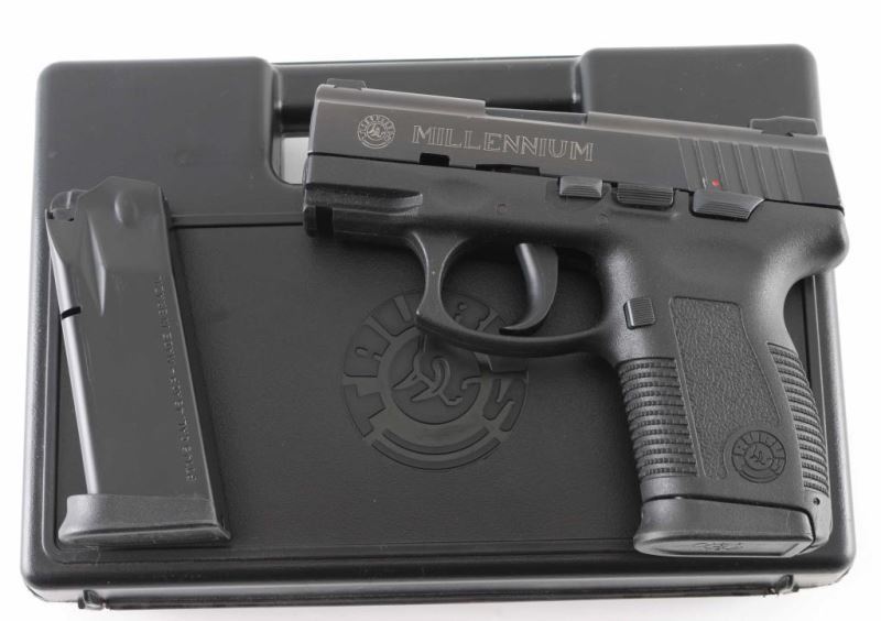 Brazilian made semiautomatic pistol imported by Taurus, Miami FL. Features blued finish, black polymer frame, 3.25" barrel, two dot sights in dovetails, double action only trigger with restrike, manual safety, push button magazine release, Taurus locking system in slide. Bore is very good condition, needs cleaning. Retains 95% finish with very little bare metal visible on sharp edges on slide. Frame is excellent. Includes (2) magazines, factory hard plastic case, manual, keys for Taurus locking system. Condition is NRA Excellent *** Modern Firearm ***