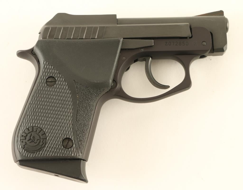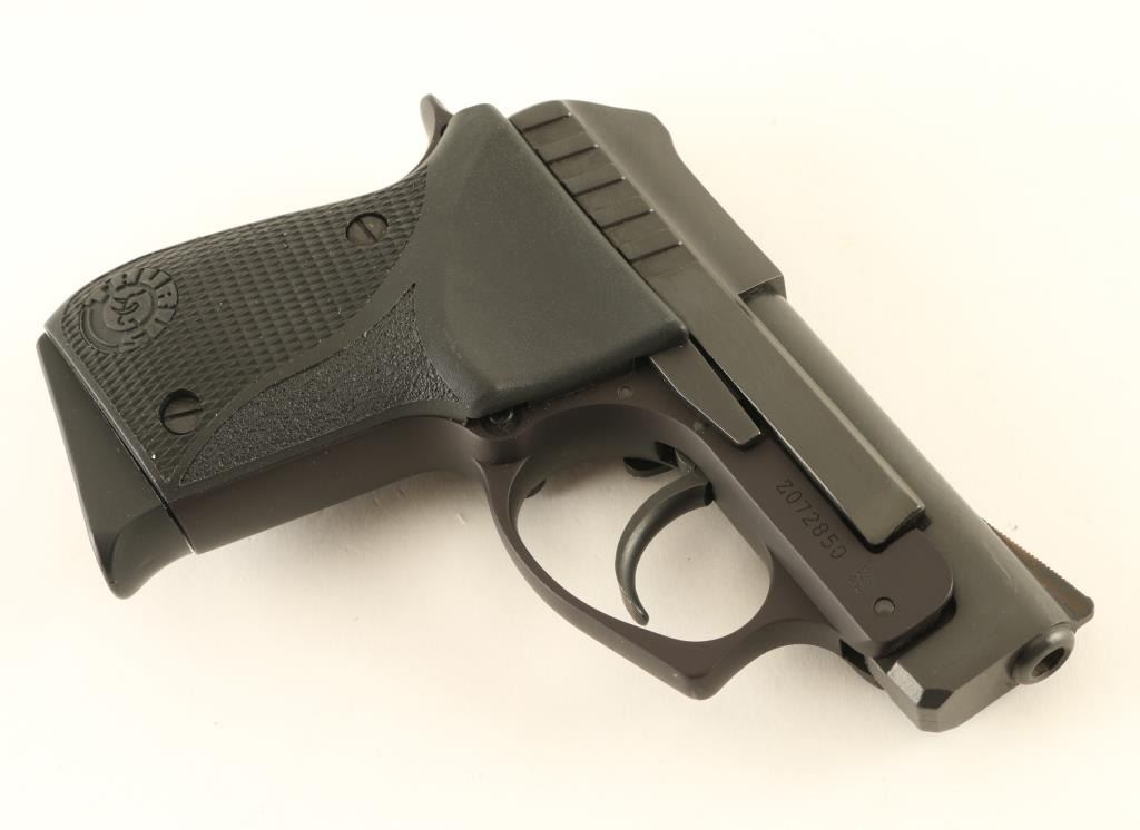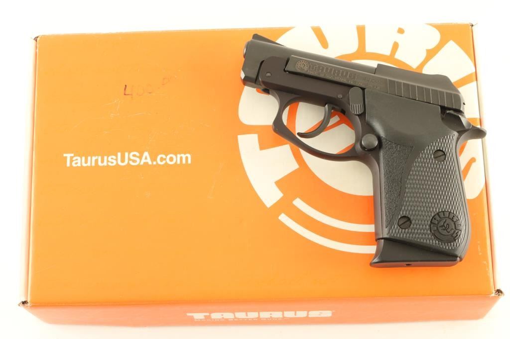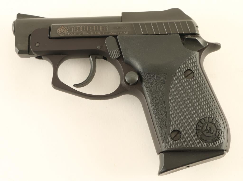 Semiautomatic rimfire pistol features blued finish, checkered black plastic grips, 2.75" tip up barrel, double action only trigger with restrike, manual safety, fixed sights, push button mag release, Taurus locking system. Overall condition is excellent with few signs of handling or use. Includes one magazine, key for Taurus locking system, manual, good condition factory cardboard box. Condition is NRA Excellent - like new *** Modern Firearm ***