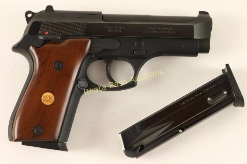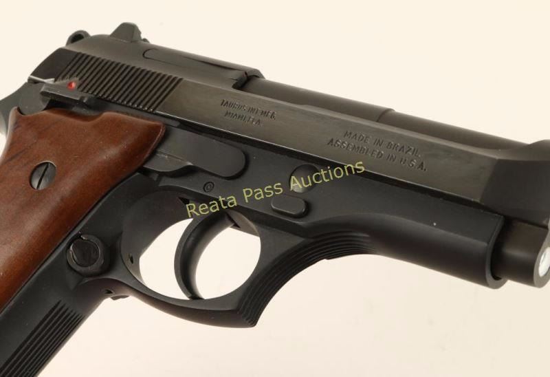 Brazilian made double action semi-automatic pistol chambered in .380 Automatic Colt Pistol. Features a blued finish, 4" barrel, three-dot sights with drift adjustable rear, serrated steel slide, smooth trigger, black finished alloy frame, ambidextrous safety, serrated grip frame, push button magazine release, 12 round magazine, and Taurus medallion smooth wood grips. Includes original factory box with manual, cleaning brush, and extra magazine. Pistol shows only light handling wear. Action is tight, bore is very good, and grips are fine with few minor blemishes.