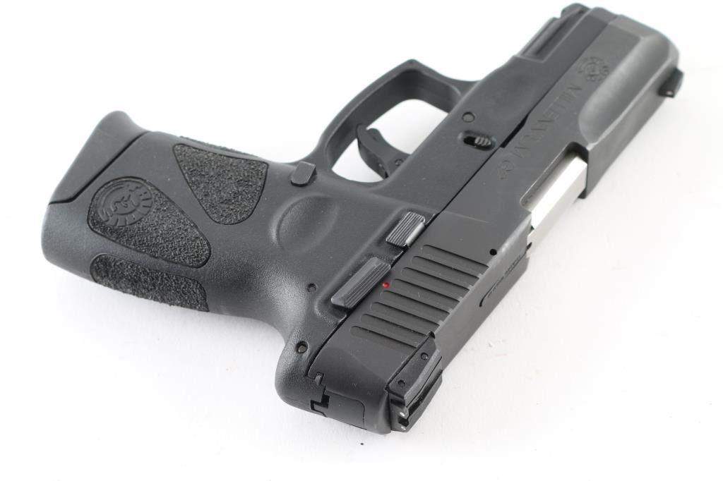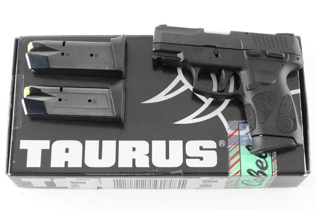 'Millennium' Brazilian made compact semiautomatic pistol. Features matte black finish, textured polymer grip frame with accessory rail, 3.2" barrel, loaded chamber indicator, 3 dot sights with adjustable rear, manual thumb safety, manual trigger safety, Taurus locking system in slide, double action only (DAO) with re-strike capability, capable of firing with magazine removed, push button magazine release. Bore is very good condition. Retains 90% finish with minor scuffs and other handling marks. Includes (3) 12-rd magazines with pinky extensions, keys for internal lock, factory cardboard box. Condition is NRA Very Good++ *** Modern Firearm ***