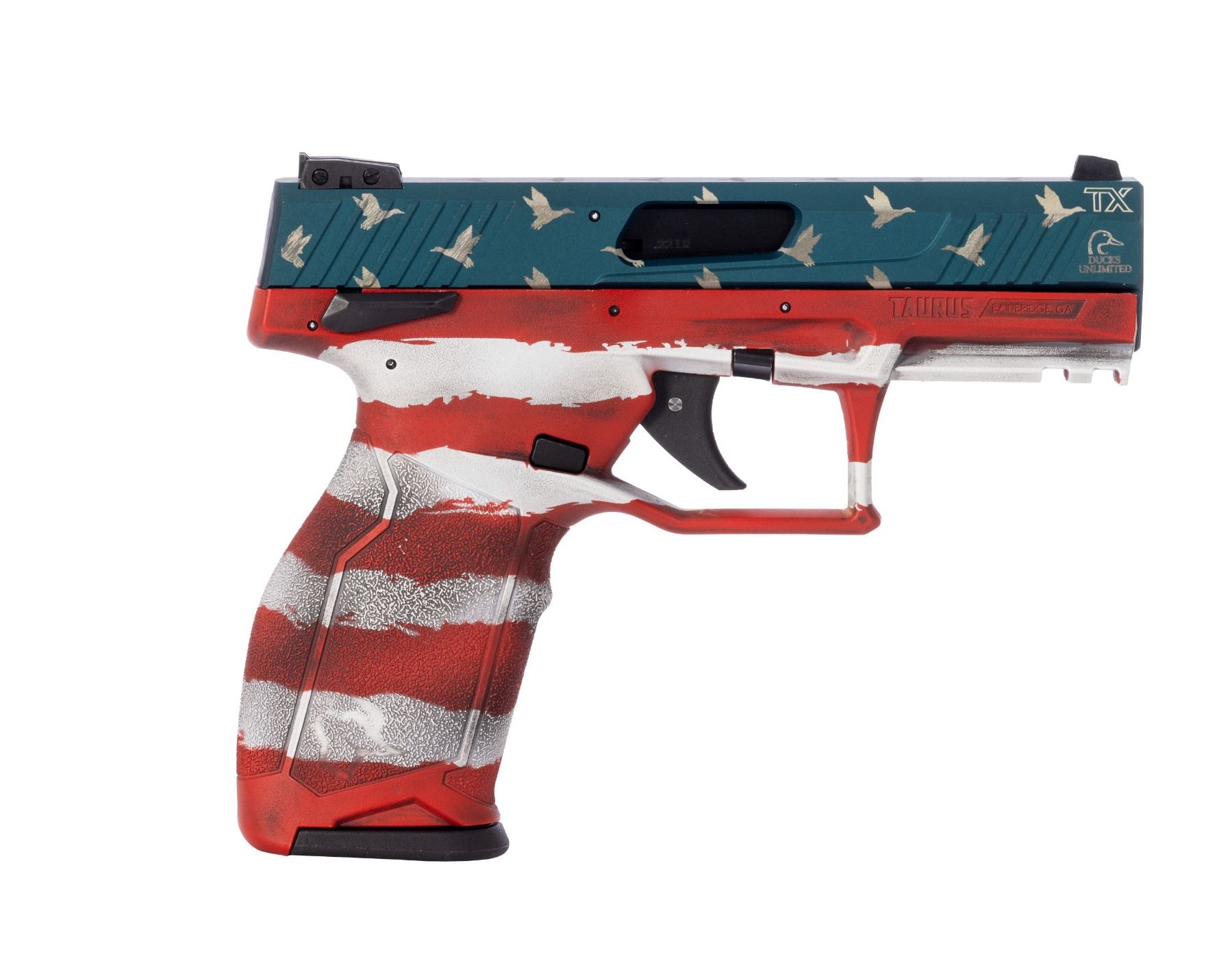 The Taurus TX22 combines precision and patriotism. This .22LR semi-auto pistol boasts a threaded barrel for customization and a 4.10” barrel length for optimal performance. With two 10-round magazines, it offers ample firepower. The pistol's striking American Flag Cerakote finish not only reflects pride but also durability. The DU logo on the slide proudly showcases the shared commitment to waterfowl conservation. Safety is paramount, and the package includes a gun lock for secure storage.
