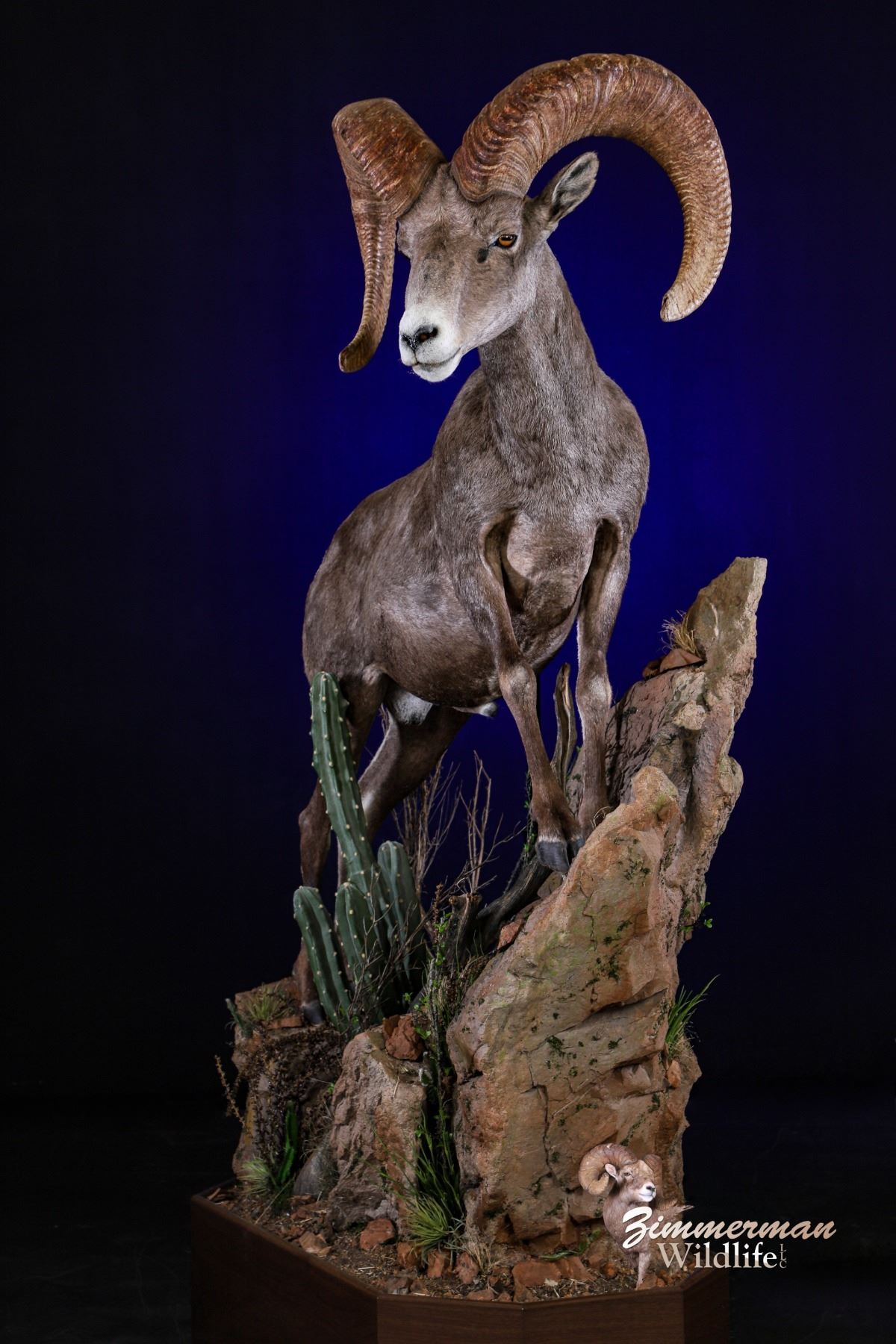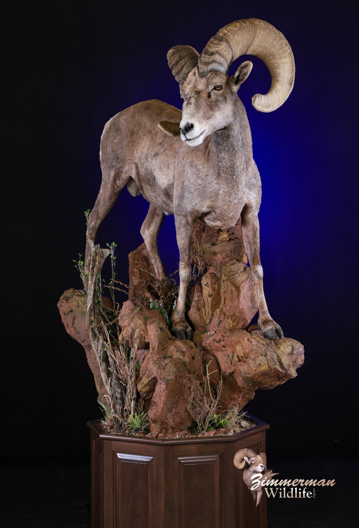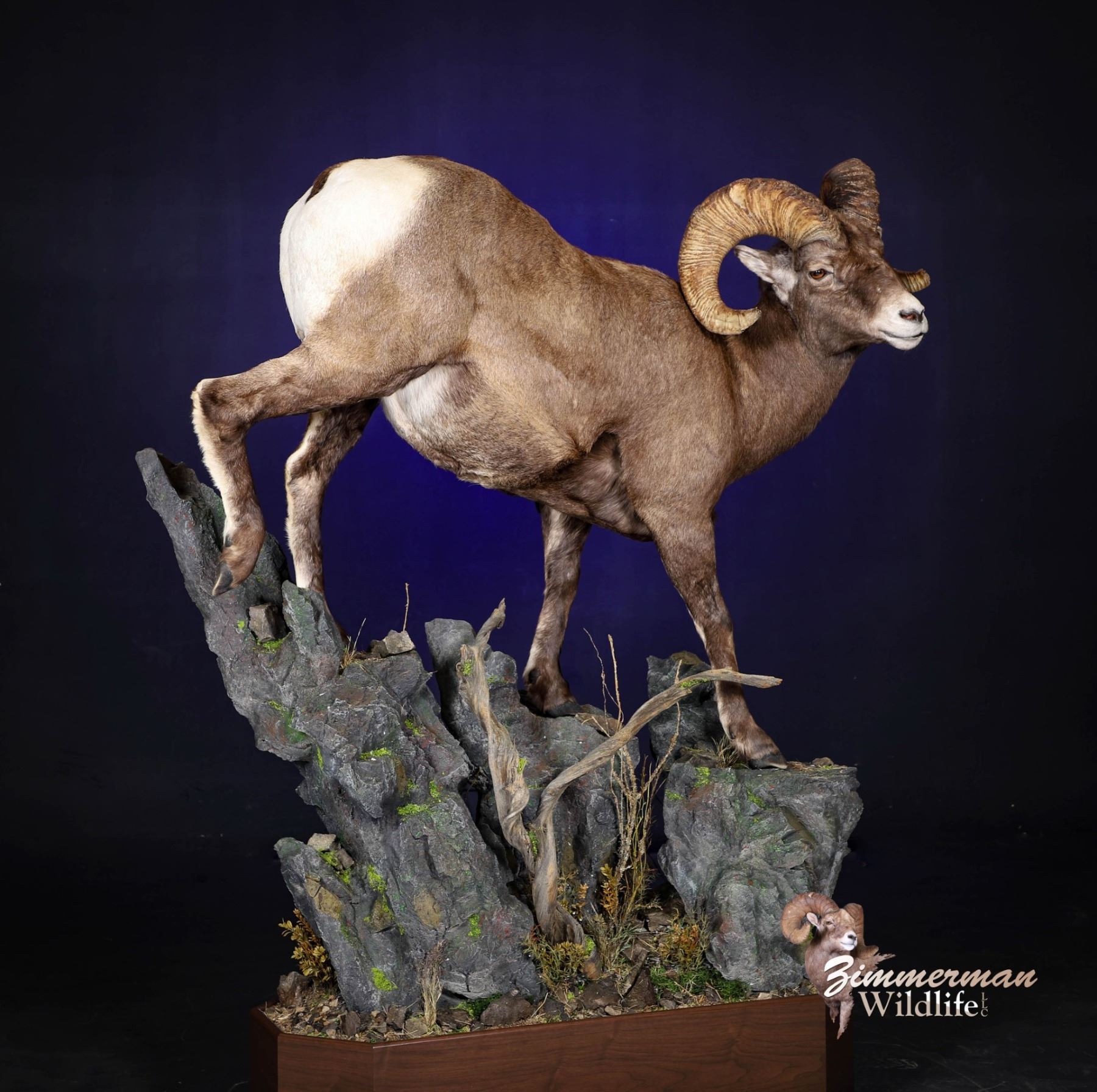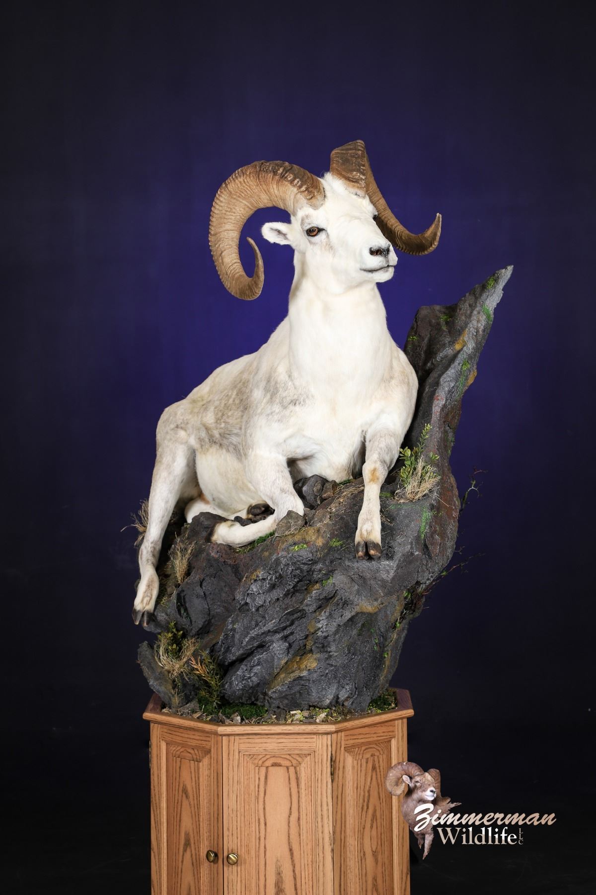 Life Size Wild Sheep mount, custom designed to purchasers' desired pose, complete with a standard 10" hardwood base with appropriate habitat.