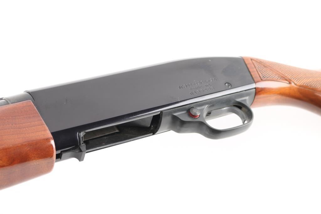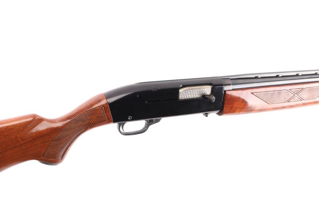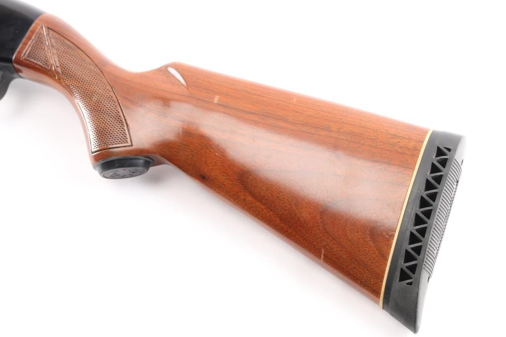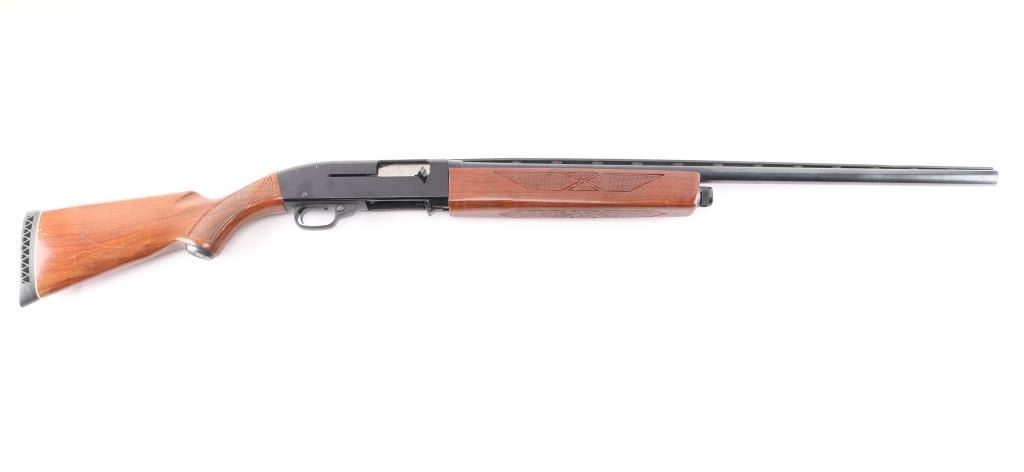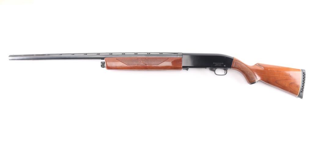 Trade name slide action repeating shotgun chambered for 2 3/4" 12 gauge shells, Winchester produced "Ted Williams Model 300." A Sears, Roebuck & Co. rebranded Winchester 1400 semi-automatic shotgun. Features a blued 28" barrel with ventilated sighting rib . fixed full choke, half-length tube magazine, brass bead front sight, smooth trigger, push button safety, black finished alloy receiver, press checkered wood slide handle and pistol grip shoulder stock with metal grip cap, factory Ted Williams recoil pad & Shotgun retains approximately 98% of its original finish showing very little wear. Action is smooth, the bore appears very good/bright and the wood stocks are near fine. Manufactured 1981, "EX" barrel code.Condition is NRA Excellent. Modern Firearm.