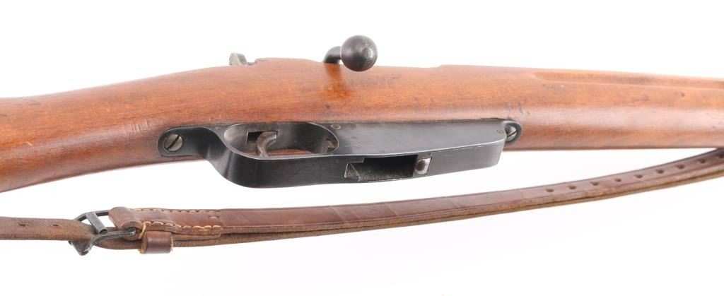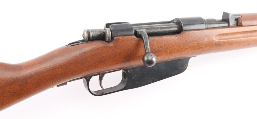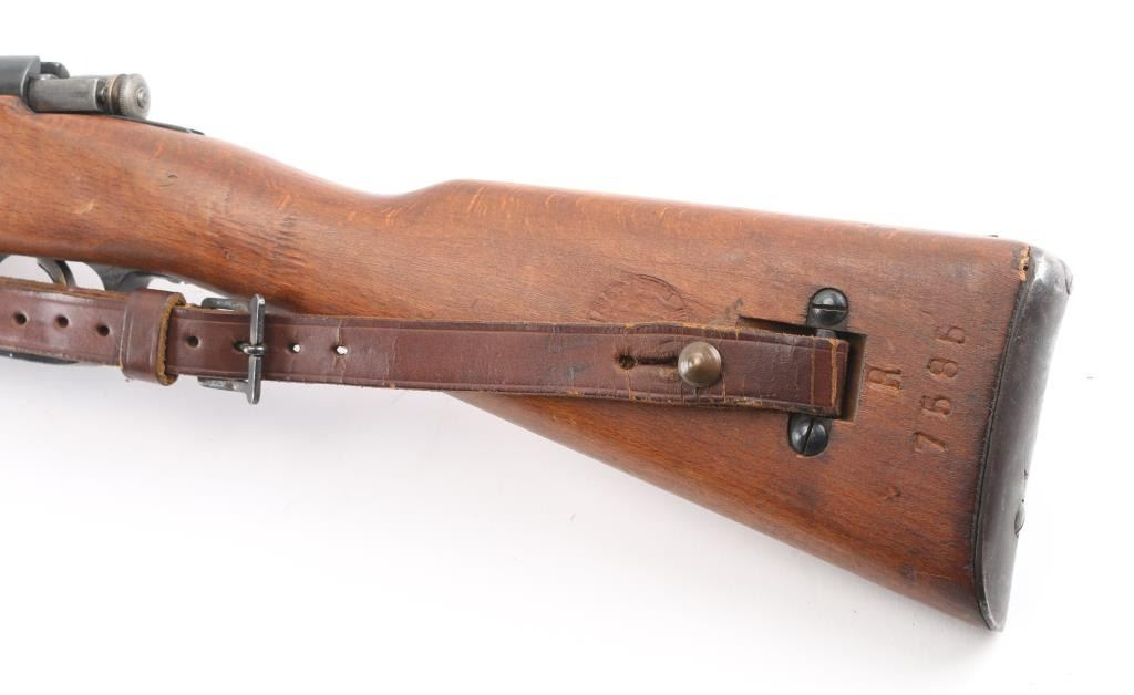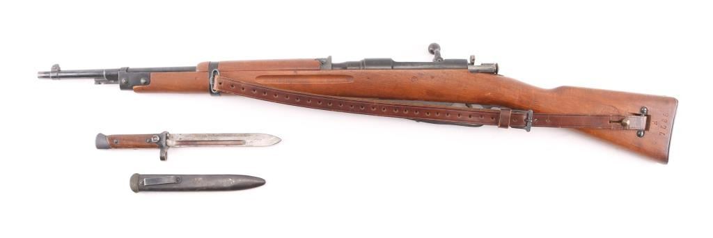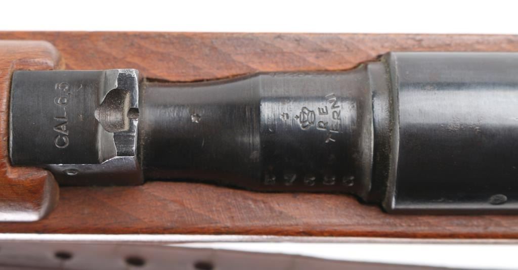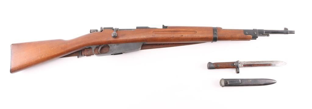 WW 2 Italian military carbine dated 1940. Features approx 21" barrel, bayonet lug, fixed sights, side mounted sling swivels, butt trap, bent bolt handle, manual safety, Mannlicher type action uses en-bloc clips (clips not included). Bore is very good with strong rifling. Retains about 85% blue finish, with handling loss, mostly on the bolt. Wood is very good condition. Matching serial numbers on barrel and stock. Terni arsenal cartouche on left stock dated 1940. Markings include "Terni", "(crown) RE", "1940 - XVIII". No import marks observed. Includes issue brown leather sling, and an original M38 Carcano folding bayonet. These bayonets are rare, and expensive. A really nice set, hard to find in this condition. NRA condition-Very Good C&R Firearm
