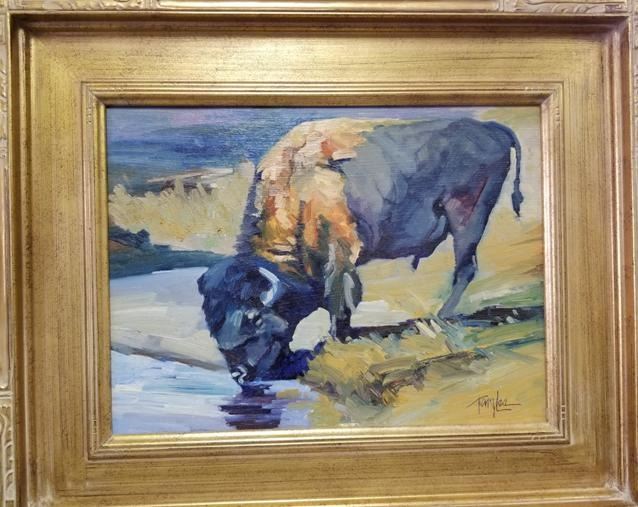 Original framed oil painting of a bison by SCI Artist of the Year, Terry Lee. The painting measures 12” x 16”.