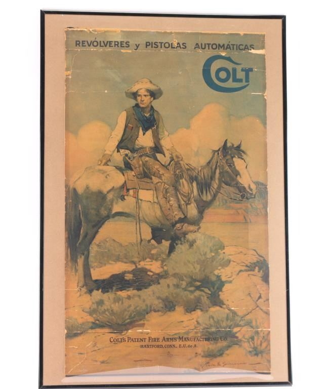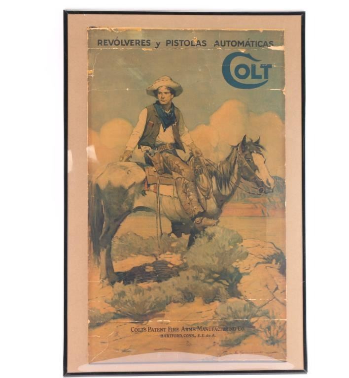 In Spanish for Colt firearms. Shows tears and separations at folding seams. Some fading and sun damage. Needs restoration. Fair to poor overall. The estate of John Kopec (1 band at bottom retained). NOTE: Excellent examples regularly fetch $7,000-$18,000 at auction.
