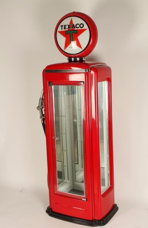 Reminiscent of the gravity fed gas pumps, has interior light and is red, white and green with 'Texaco' and star logo on top. Metal, glass and plastic construction. Glass front door locks and key is included. Right side of case is also glass to display treasures Interior has pegs for shelving. Measures74"h x 26"w x 14"d, comes electrified and ready to plug in your man cave or garage.