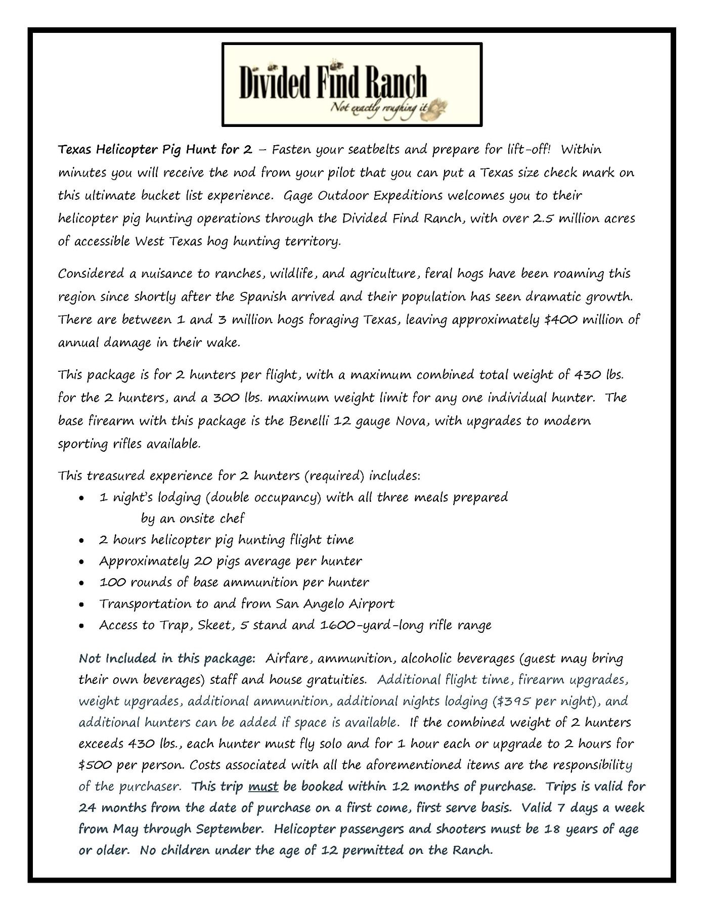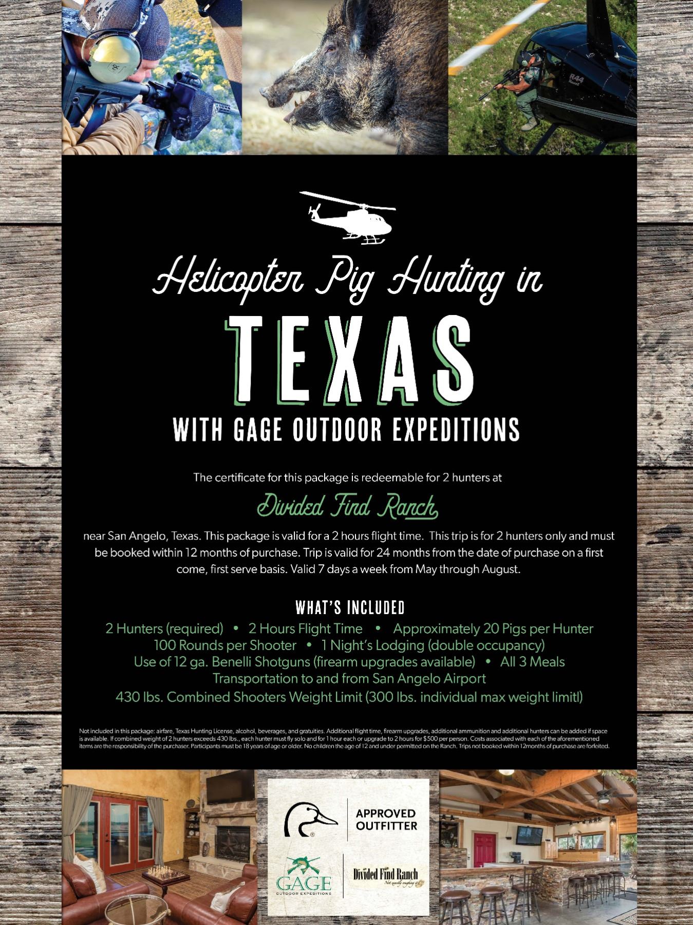 Fasten your seatbelts and prepare for lift-off! Within minutes you will receive the nod from your pilot that you can put a Texas size check mark on this ultimate bucket list experience. Gage Outdoor Expeditions welcomes you to their helicopter pig hunting operations through the Divided Find Ranch, with over 2.5 million acres of accessible West Texas hog hunting territory. Considered a nuisance to ranches, wildlife, and agriculture, feral hogs have been roaming this region since shortly after the Spanish arrived and their population has seen dramatic growth. There are between 1 and 3 million hogs foraging Texas, leaving approximately $400 million of annual damage in their wake. This package is for 2 hunters per flight, with a maximum combined total weight of 430 lbs. for the 2 hunters, and a 300 lbs. maximum weight limit for any one individual hunter. The base firearm with this package is the Benelli 12 gauge Nova, with upgrades to modern sporting rifles available. This treasured experience for 2 hunters (required) includes: 1 night’s lodging (double occupancy) with all three meals prepared by an onsite chef. 2 hours helicopter pig hunting flight time. Approximately 20 pigs average per hunter. 100 rounds of base ammunition per hunter. Transportation to and from San Angelo Airport. Access to Trap, Skeet, 5 stand and 1600-yard-long rifle range. Not Included in this package: Airfare, ammunition, alcoholic beverages (guest may bring their own beverages) staff and house gratuities. Additional flight time, firearm upgrades, weight upgrades, additional ammunition, additional nights lodging ($395 per night), and additional hunters can be added if space is available. If the combined weight of 2 hunters exceeds 430 lbs., each hunter must fly solo and for 1 hour each or upgrade to 2 hours for $500 per person. Costs associated with all the aforementioned items are the responsibility of the purchaser. This trip must be booked within 12 months of purchase. Trips is valid for 24 months from the date of purchase on a first come, first serve basis. Valid 7 days a week from May through September. Helicopter passengers and shooters must be 18 years of age or older. No children under the age of 12 permitted on the Ranch.