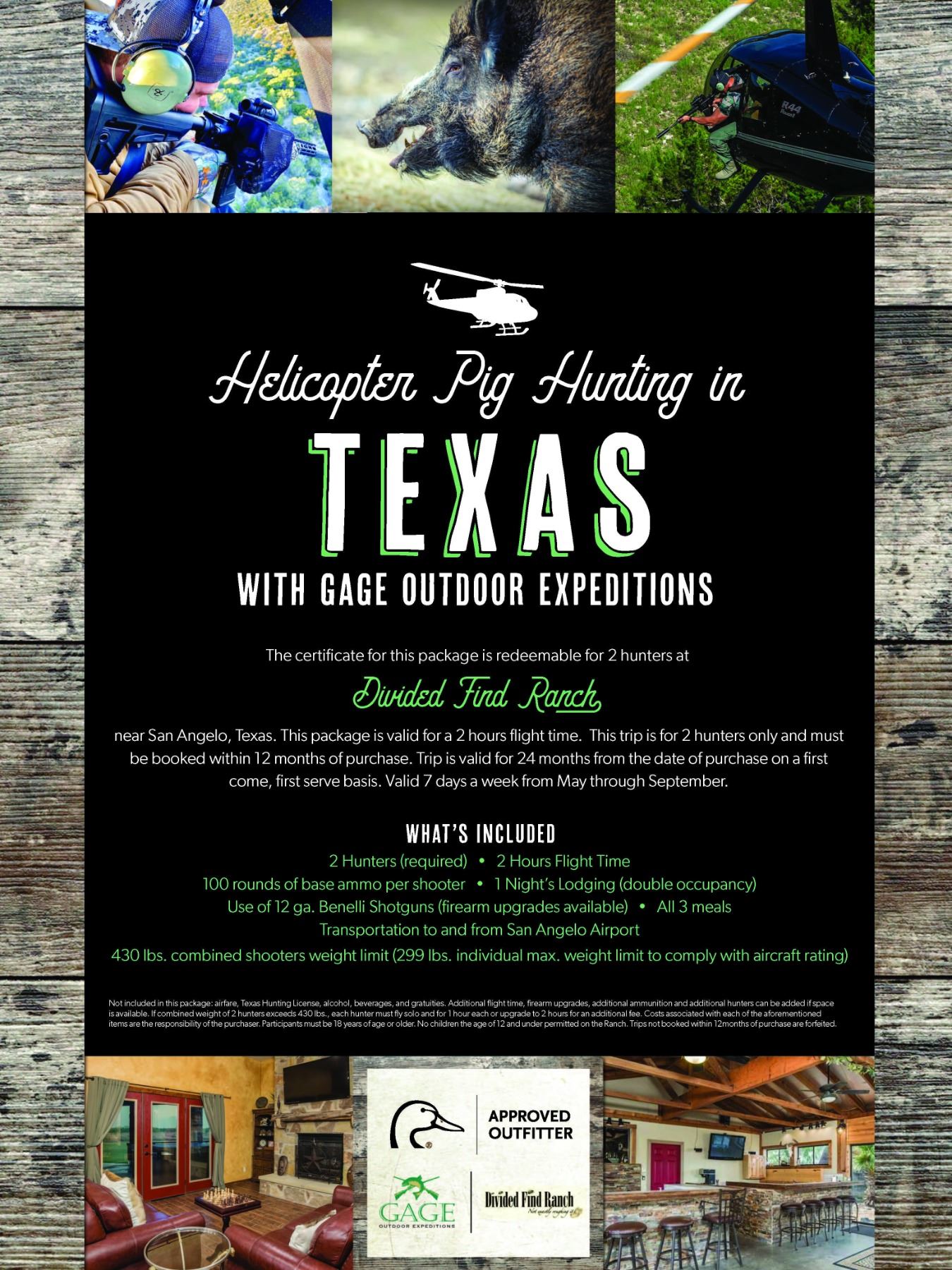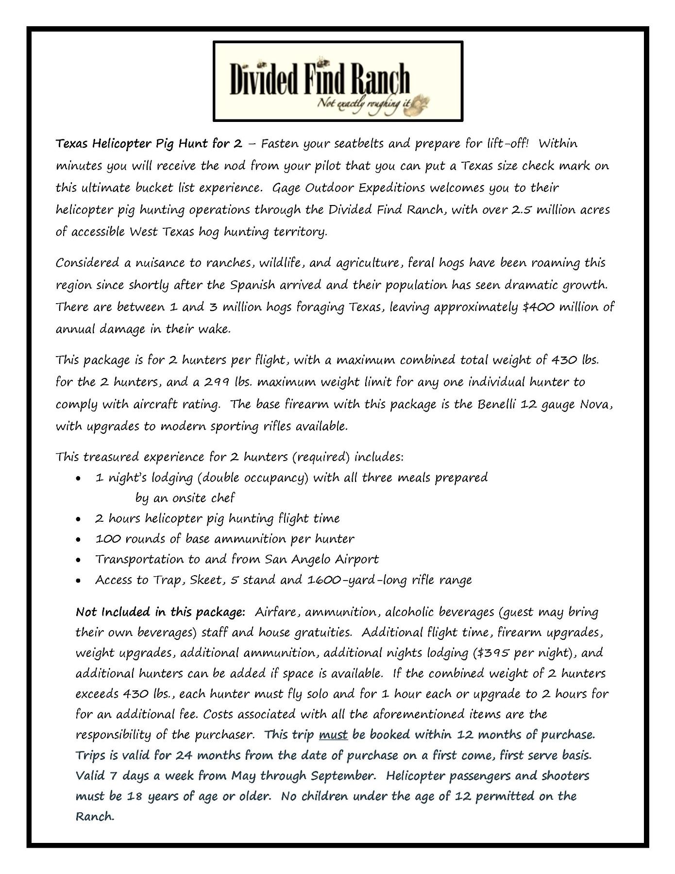Fasten your seatbelts and prepare for lift-off! Within minutes you will receive the nod from your pilot that you can put a Texas size check mark on this ultimate bucket list experience. Gage Outdoor Expeditions welcomes you to their helicopter pig hunting operations through the Divided Find Ranch, with over 2.5 million acres of accessible West Texas hog hunting territory. Considered a nuisance to ranches, wildlife, and agriculture, feral hogs have been roaming this region since shortly after the Spanish arrived and their population has seen dramatic growth. There are between 1 and 3 million hogs foraging Texas, leaving approximately $400 million of annual damage in their wake. This package is for 2 hunters per flight, with a maximum combined total weight of 430 lbs. for the 2 hunters, and a 299 lbs. maximum weight limit for any one individual hunter to comply with aircraft rating. The base firearm with this package is the Benelli 12 gauge Nova, with upgrades to modern sporting rifles available. This treasured experience for 2 hunters (required) includes: 1 night’s lodging (double occupancy) with all three meals prepared by an onsite chef, 2 hours helicopter pig hunting flight time, 100 rounds of base ammunition per hunter, Transportation to and from San Angelo Airport, Access to Trap, Skeet, 5 stand and 1600-yard-long rifle range. Not Included in this package: Airfare, ammunition, alcoholic beverages (guest may bring their own beverages) staff and house gratuities. Additional flight time, firearm upgrades, weight upgrades, additional ammunition, additional nights lodging ($395 per night), and additional hunters can be added if space is available. If the combined weight of 2 hunters exceeds 430 lbs., each hunter must fly solo and for 1 hour each or upgrade to 2 hours for for an additional fee. Costs associated with all the aforementioned items are the responsibility of the purchaser. This trip must be booked within 12 months of purchase. Trips is valid for 24 months from the date of purchase on a first come, first serve basis. Valid 7 days a week from May through September. Helicopter passengers and shooters must be 18 years of age or older. No children under the age of 12 permitted on the Ranch.