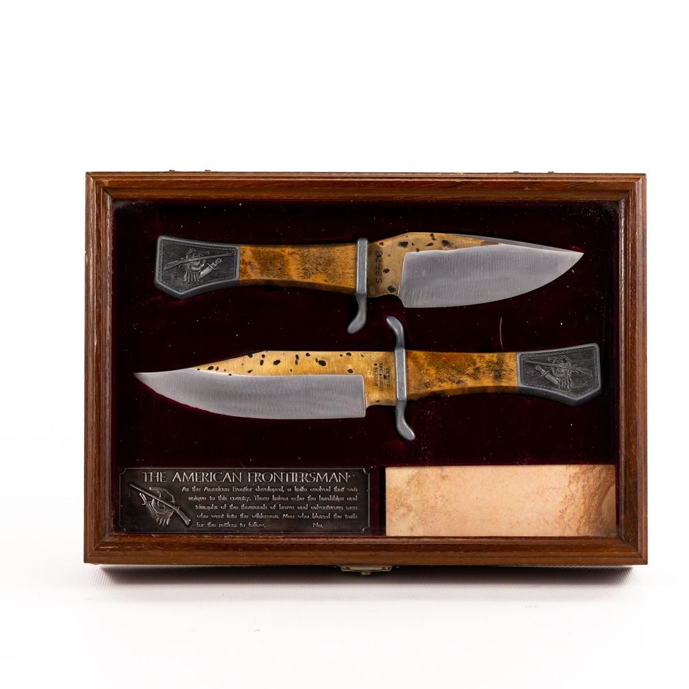 The American FRONTIERSMAN Limited Edition (Number 2292) Knife Set in excellent condition. Two beautiful steel and wood knives (9.75", 10.75" OAL) in a wooden display case with a whet stone and a numbered plaque. Made in Olean NY