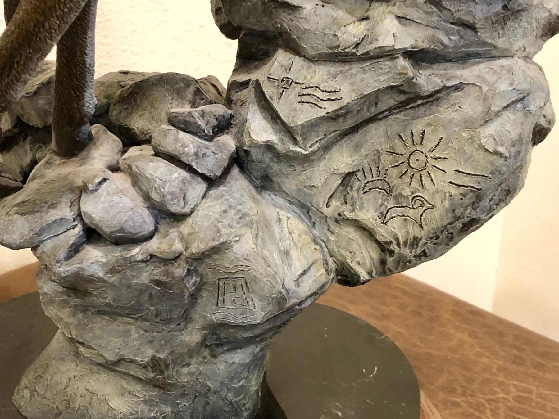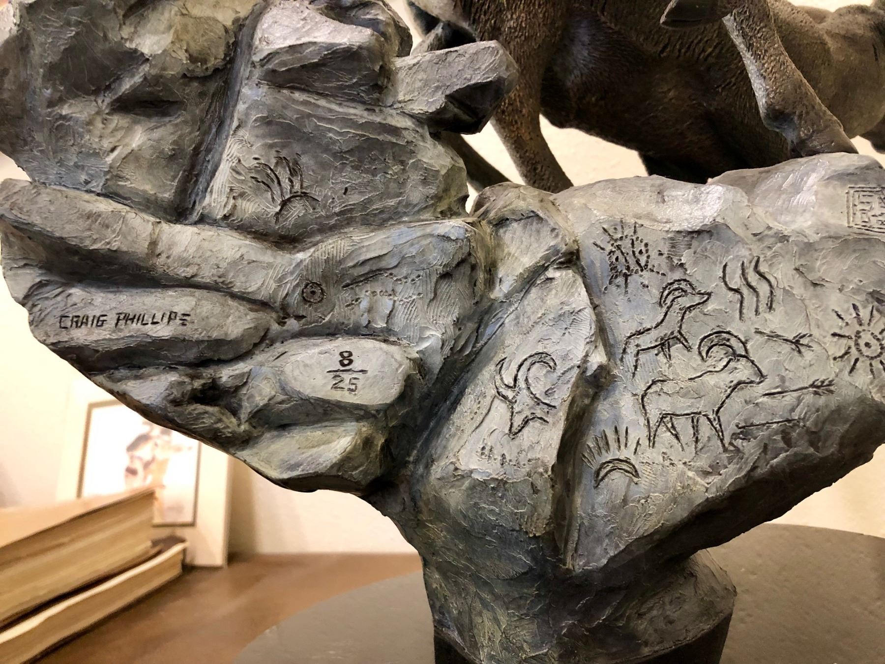A Craig Phillips signed and numbered limited edition bronze sculpture (#8 of 25) entitled “The Ancient Ones”. Wildlife and western artist sculptor Craig Phillips resides in Thompson Falls, MT and is well known for working with field observations to achieve great accuracy and feeling for his Big Game Sculptures. “The Ancient Ones” features 2 Big Horn Sheep running down a mountain cliff. The cliffs are covered with detailed Native American Petroglyphs. The bronze sits on a marble base on top of a wooden pedestal with an engraved plate stating artist name and title of the sculpture. Including pedestal approximate measurements are 19” height, 21” width, 10” depth.