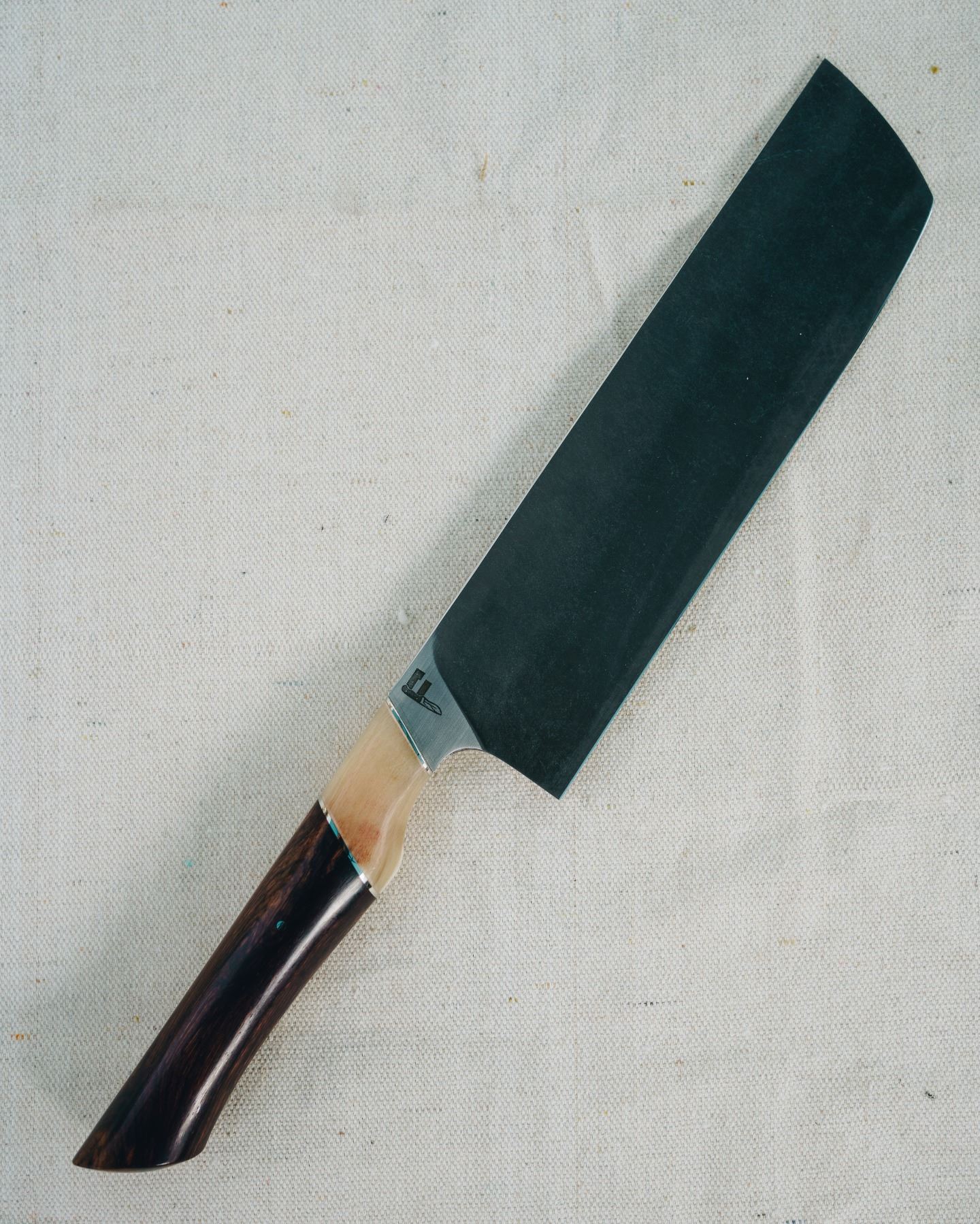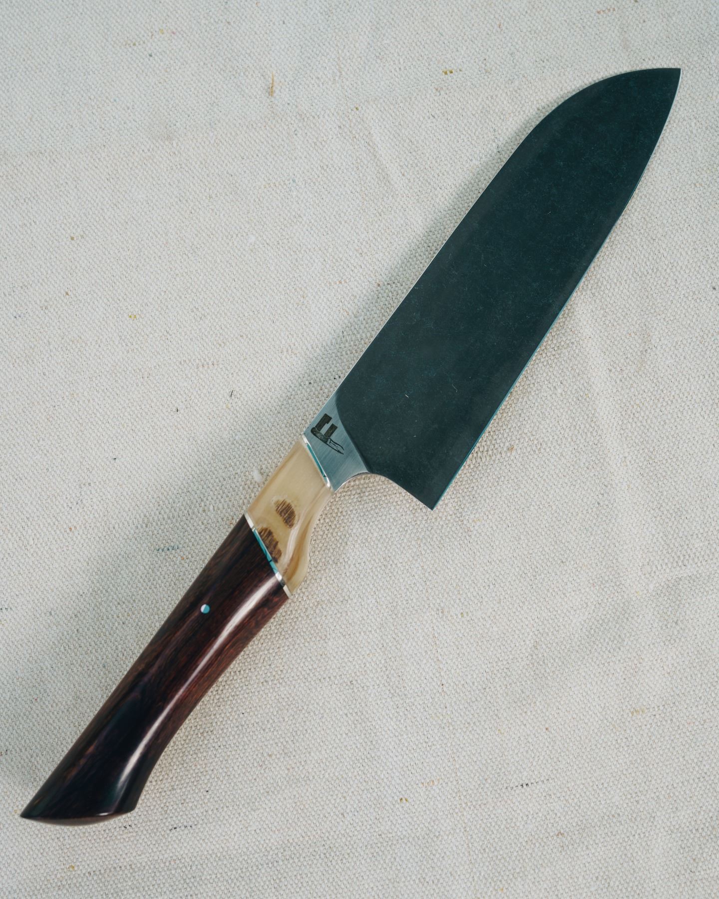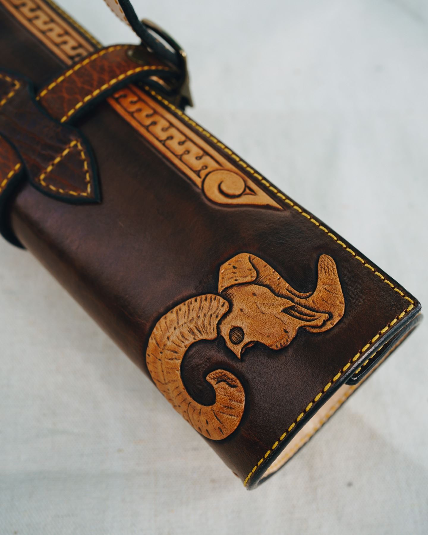 Acid contrast finish, Nitro-V stainless steel blades with Bighorn sheep horn and Mexican Kingwood handles. Stainless steel accents. All wrapped in a hand carved, handmade leather knife roll with Bison accents.