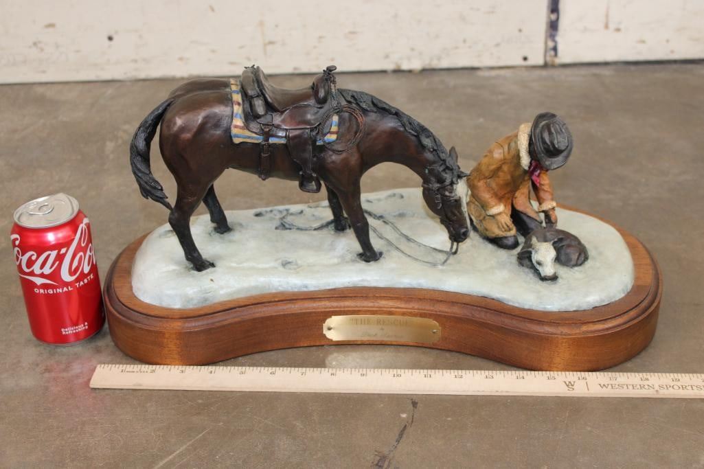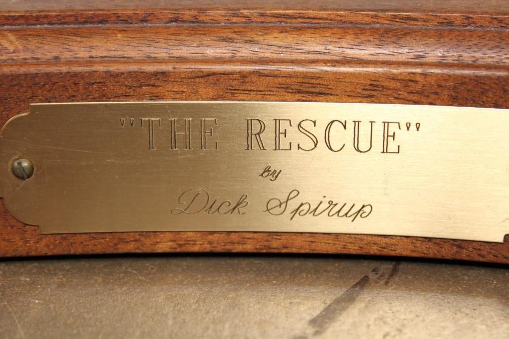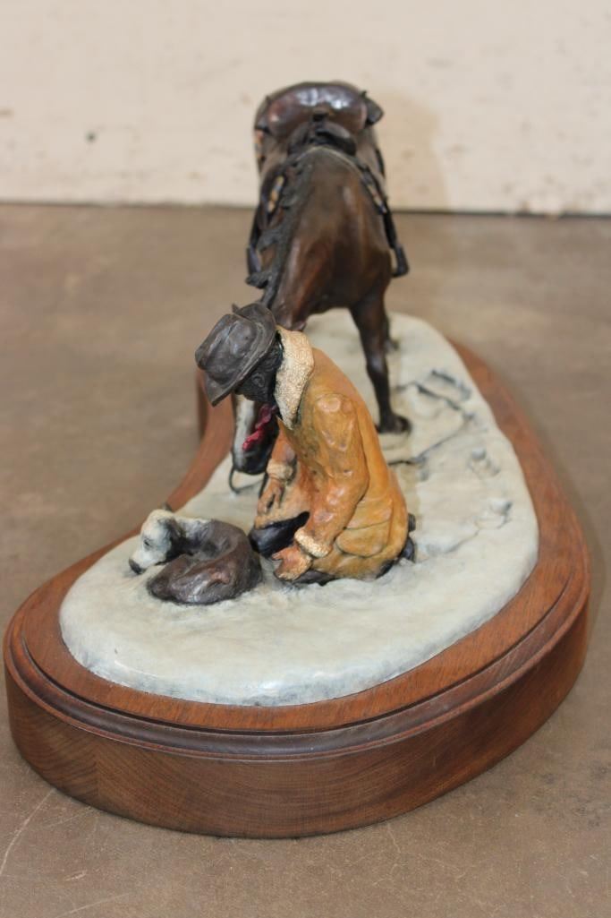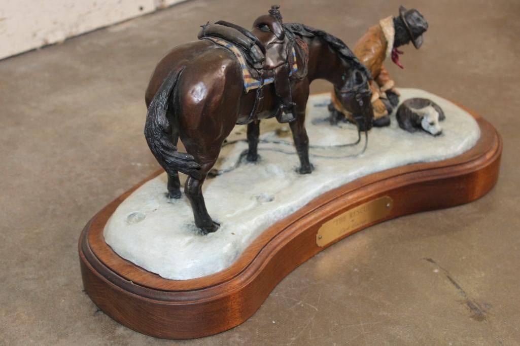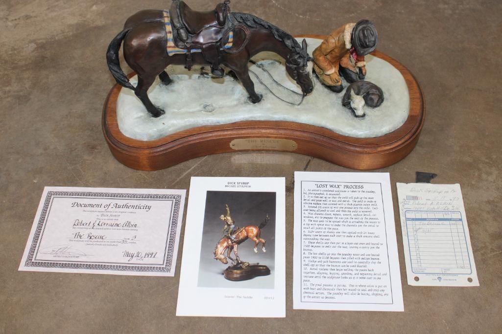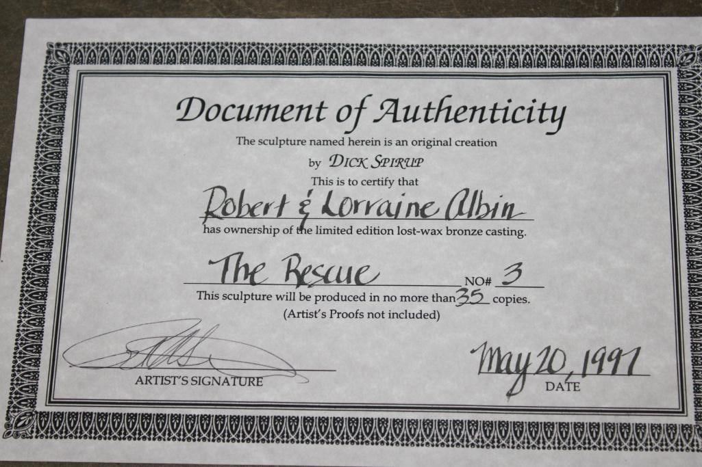 "The Rescue" Original BRONZE Sculpture. The artist Dick Spirup's signature can be seen and it has been numbered #3/35. It is complete with a Certificate of Authenticity signed by Dick Spirup and dated May 20, 1997. Also included is the original receipt for this piece for $1750.00. It measures 20" Long x 10.5" Wide x 9" Tall. The Total Weight is 27 lbs 14 oz. The next Lot is the matching "The Rescue" framed Art Print by Teresa Black. COLLECTIBLE BRONZE SCULPTURES