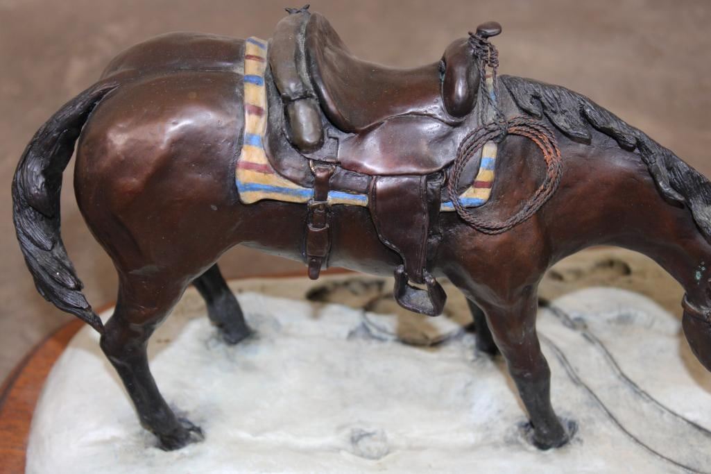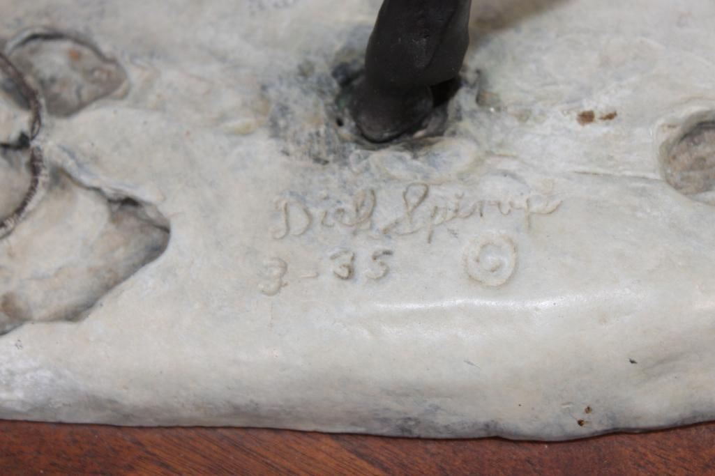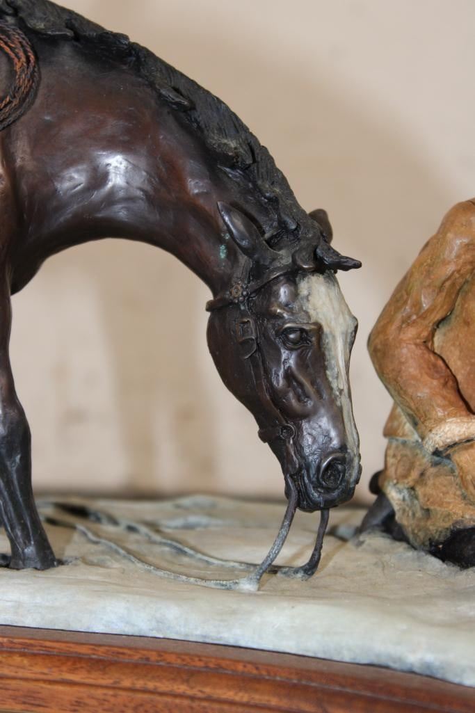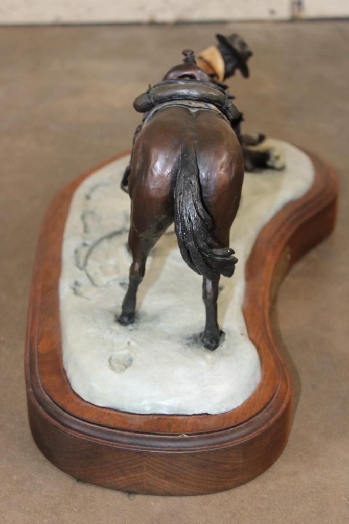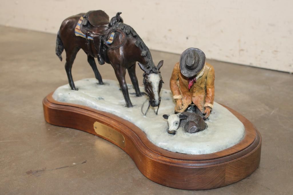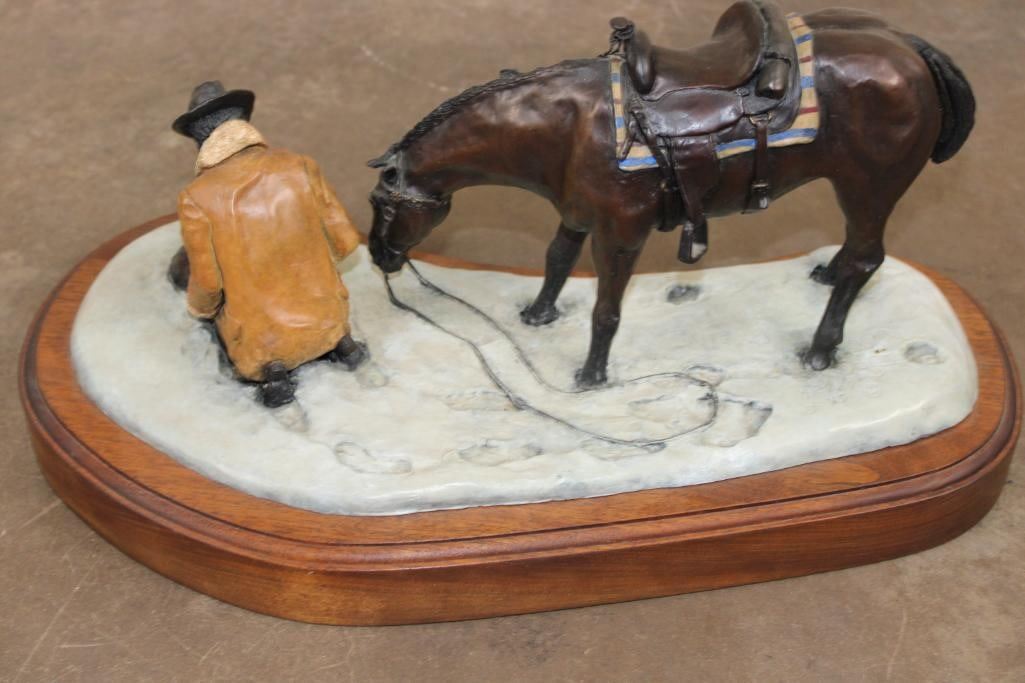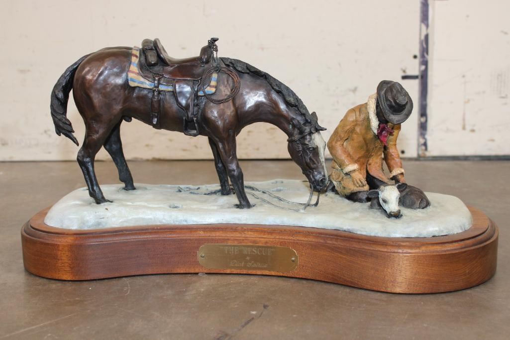 "The Rescue" Original BRONZE Sculpture. The artist Dick Spirup's signature can be seen and it has been numbered #3/35. It is complete with a Certificate of Authenticity signed by Dick Spirup and dated May 20, 1997. Also included is the original receipt for this piece for $1750.00. It measures 20" Long x 10.5" Wide x 9" Tall. The Total Weight is 27 lbs 14 oz. The next Lot is the matching "The Rescue" framed Art Print by Teresa Black. COLLECTIBLE BRONZE SCULPTURES