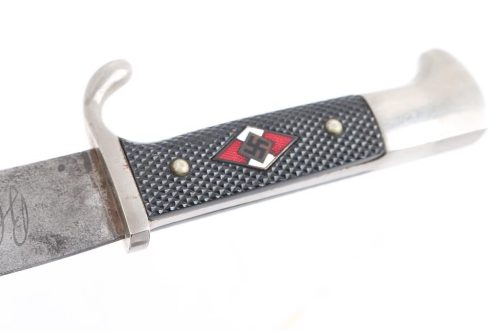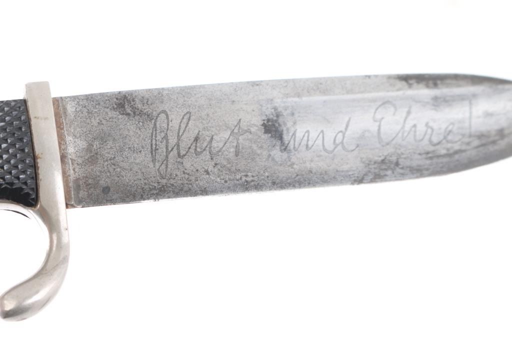 Early example with the motto maker marked blade . 5.5" blade. Nickeled steel, HJ diamond in right grip. Blade etched " Blut und Ehre" (Blood and Honor), reverse stamped "J.A, Henckels. Solingen, Zwillingswerk" below two intertwined stick figures motto, below id stamped "Ges. Geschutzt". Black painted scabbard is about 60% with paint scuffed of, mostly to the front, leather is good/intact.. Overall good condition. The early ones with the motto are getting scarce. the motto is a little worn but readable. the pommel/crossguard are very good, blade has some dark patches of very light pin-prick pitting.