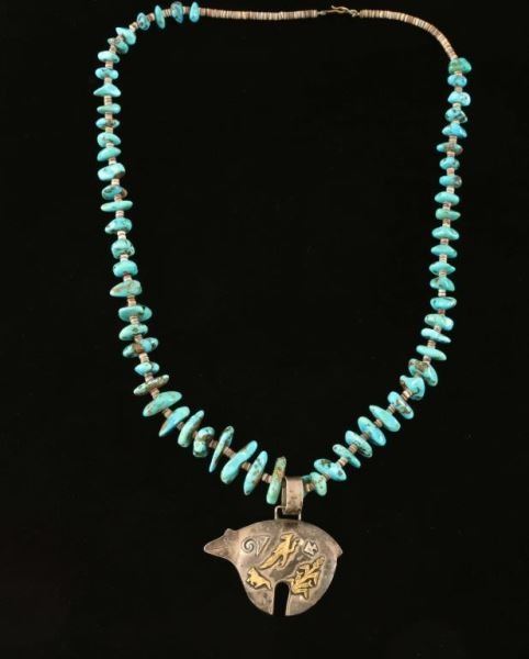 Sterling silver bear shaped pendant with corn, roadrunner and horse designs in 12 KT gold. Marked 'Thomas Singer'. Necklace is natural turquoise stones alternating with heishi beads.
