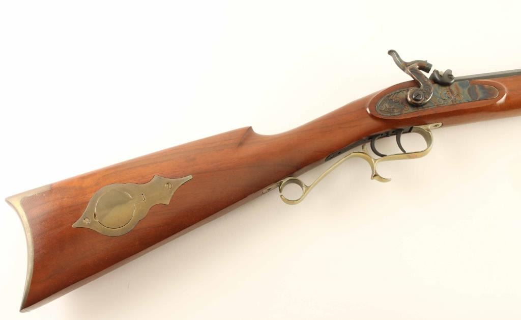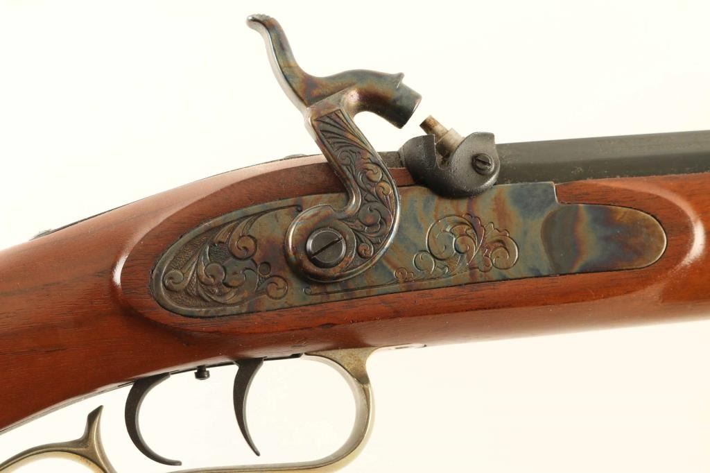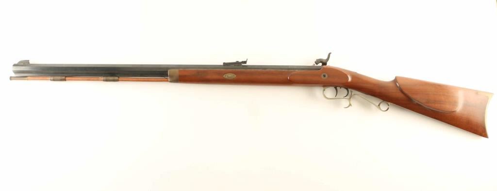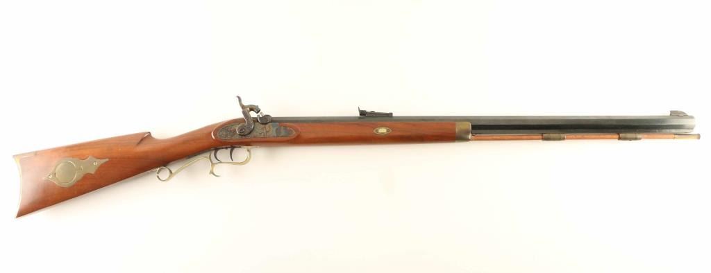 Single barrel muzzleloading percussion rifle features 29" octagonal barrel, right side lock, adjustable sights, double set triggers, ramrod under barrel, brass patch box, crescent buttplate. Bore appears very good, needs cleaning to remove dust. Blued barrel and case color lock are very good condition with few scratches and minimal bare metal showing on sharp edges. Brass parts are smooth, buttplate has reddish aged patina. Wood is very good to excellent condition. Condition is NRA Excellent *** Antique Firearm ***
