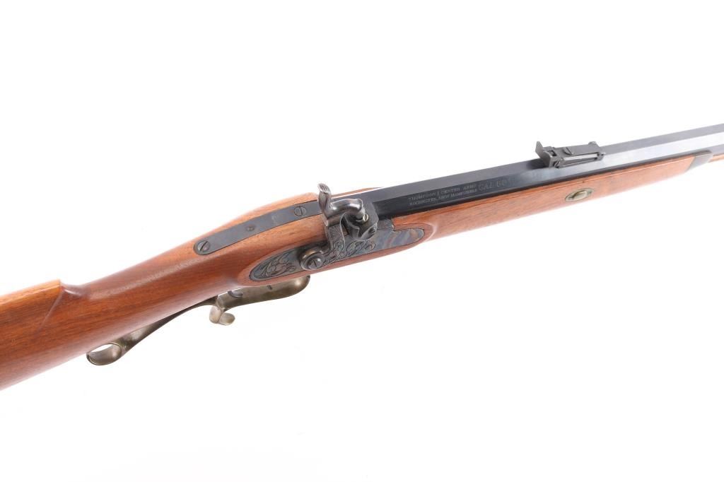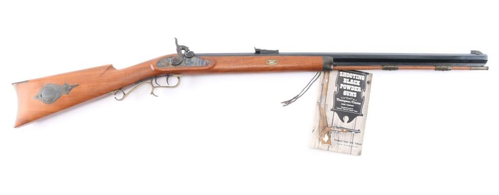Single shot muzzle loading percussion plains rifle uses Black Powder (or Pyrodex or similar powder) only. Features blued 28" octagon barrel, blade/bead front & adjustable u notch rear sight, wood ramrod under barrel, half stock with brass plated fittings, crescent buttplate, patch box, double set triggers, case colored lock. Rifle appears unfired, in like new condition with few handling marks, rifled bore is excellent, dusty. Comes with manual/paperwork.
