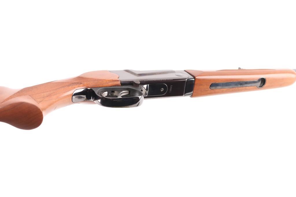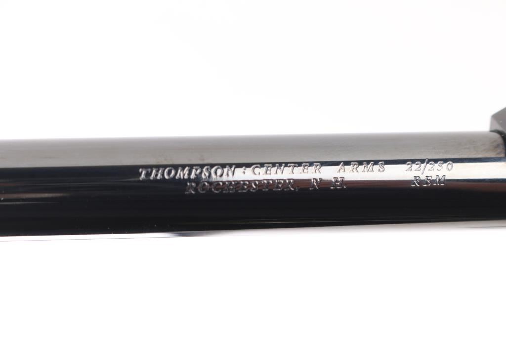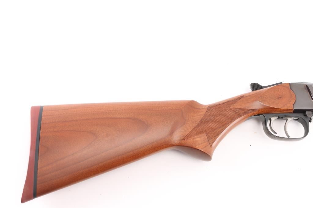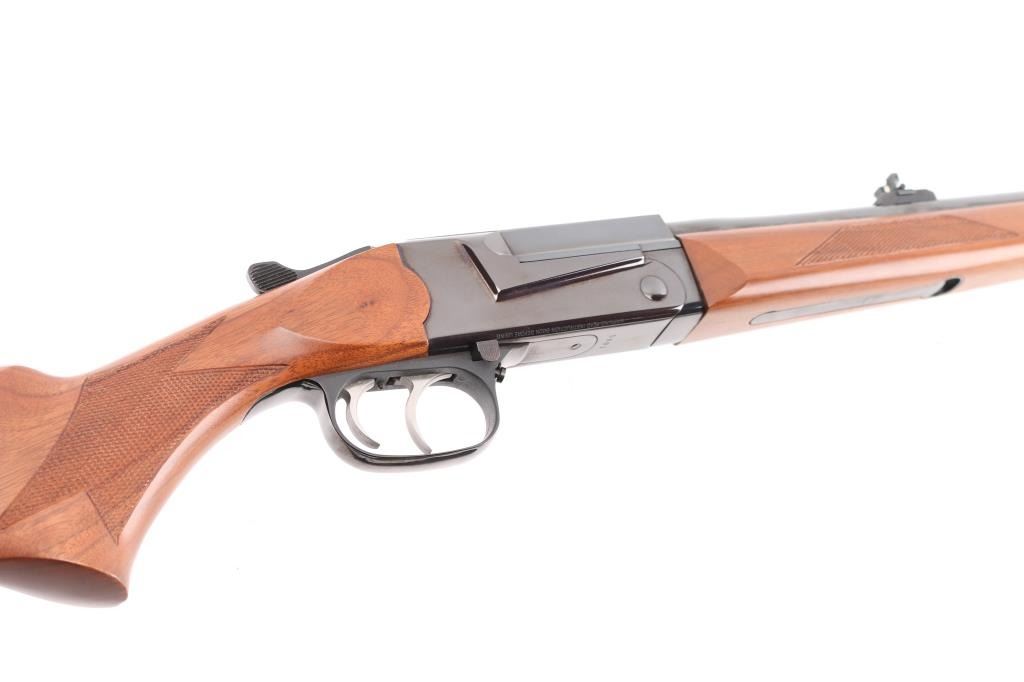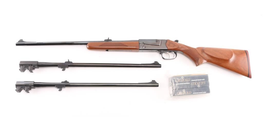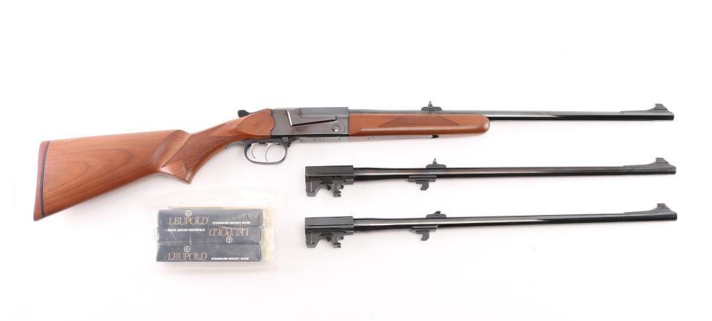 Finely crafted modular break-open single shot rifle. Features a blued finish, 23" tapered barrel, ramped blade front sight, folding leaf adjustable rear sight, extractor, double set triggers, cross-bolt safety, bushed firing pin, serrated top lever, contoured walnut forend with hand checkering and fancy figured semi-pistol grip shoulder stock with right-handed cheek piece, red factory recoil pad & 14” LOP. Bore is very good condition. Rifle retains approximately 95% of its blued finish showing scattered handling marks/wear. Wood is very good to excellent with scratches and few creases. Includes factory cardboard box with manual, three Leupold scope bases for this model, two excellent condition spare barrels (22-250 & 270 Win) in factory boxes. Condition is near NRA Excellent *** Modern Firearm ***