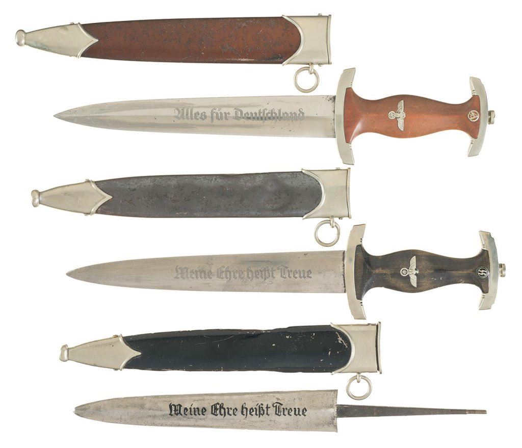 All three follow overall regulation patterns for the SA and SS. 1) SS-style dagger, marked "188/36", 12 7/8" OAL, 8 1/4" blade. Grip absent, poor overall. 2) Robert Klass SS dagger, 13 5/8" OAL, 8 5/8" blade. Fair, cleaned blade, dented sheath. 3) H. Herder SA dagger, 13 3/4" OAL, 8 3/4" blade, "He" marked guard. Good.