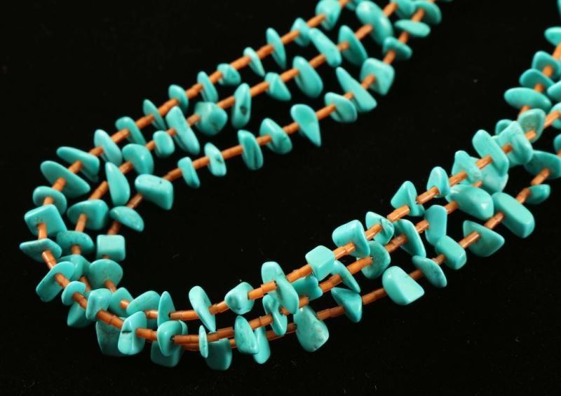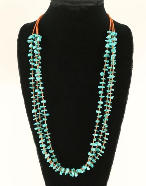 Turquoise chips with dark orange heishi. Sterling cones and clasp. About 29 1/2" long by Lula Begay.