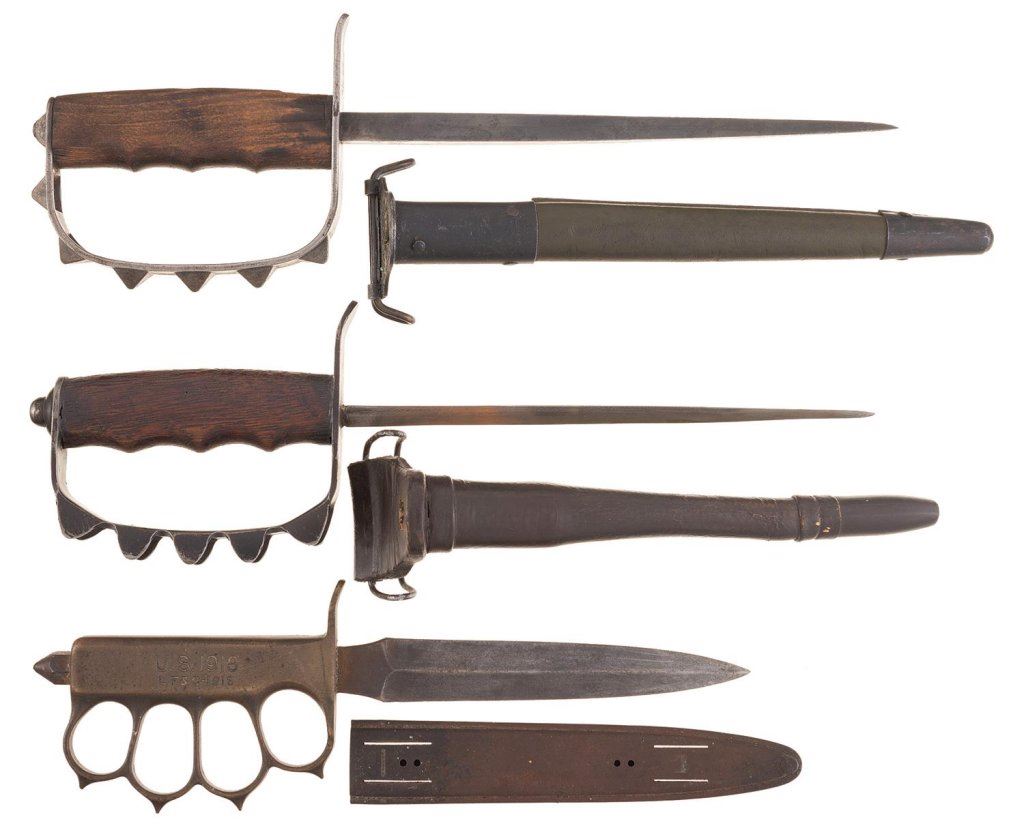 Lot includes 1) "U.S. 1918/L.F & C-1918" marked Mark I trench knife with sheath. Fair with and aged patina, oxidation on the sheath and a dark patina on the blade. 2) "U.S./L.F. & C. /1917" marked Model 1917 trench knife with sheath. Fine showing some mild pitting on the blade, handling marks and a dark aged patina overall. 3) "A.C.CO. U.S.A. 1917" Model 1917 marked trench knife with sheath. Fair the blade shows signs of grinding with some oxidation, general handling marks, and dark aged patina overall. The sheath is a replacement.