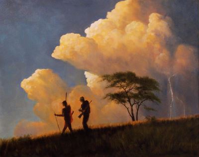 This stunning piece, measuring 24" x 30" tells a story of a hunter with his Massai guide returning to camp because of an approaching thunderstorm.
