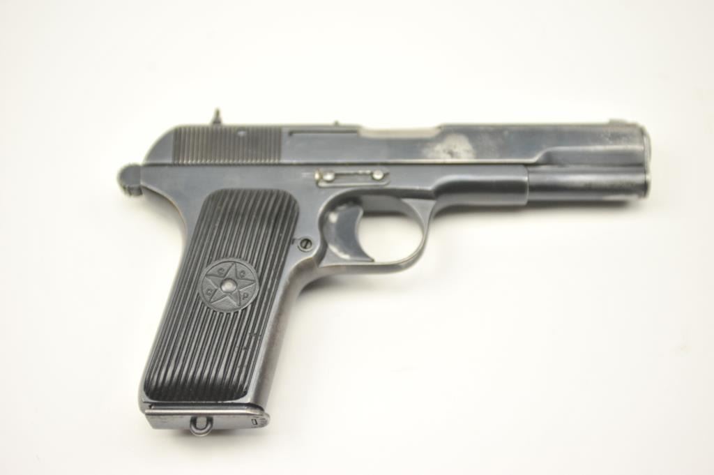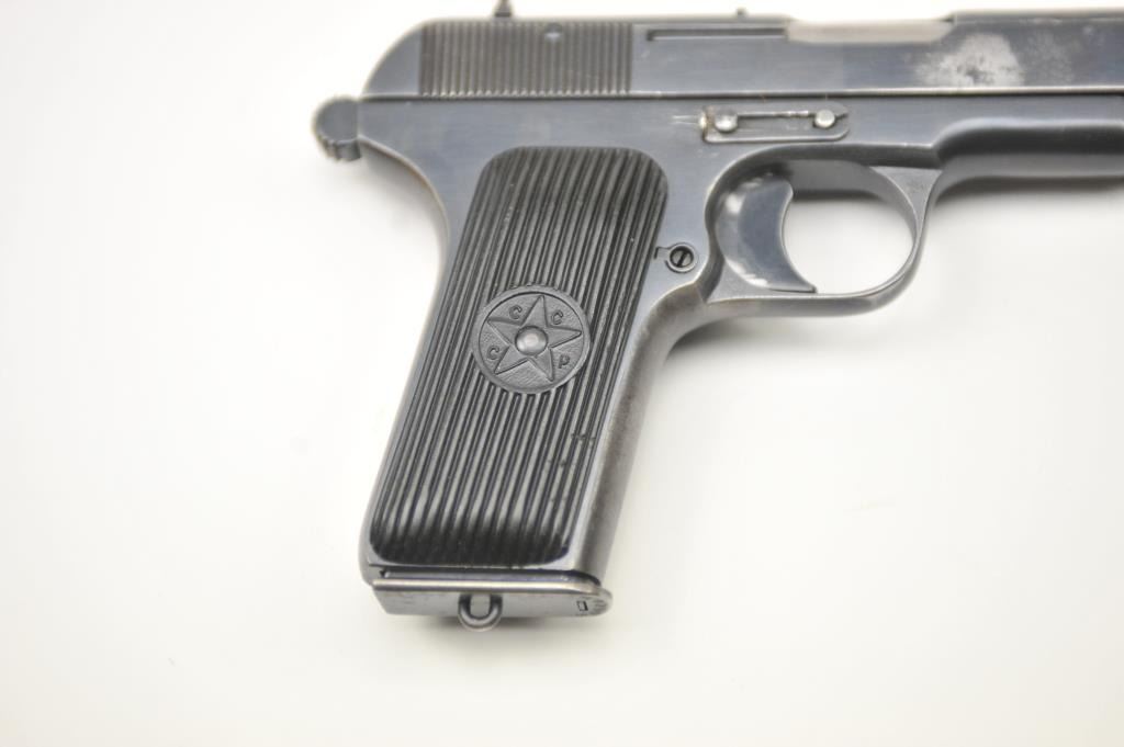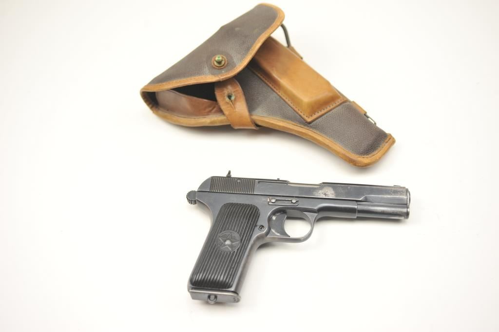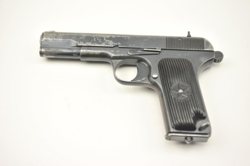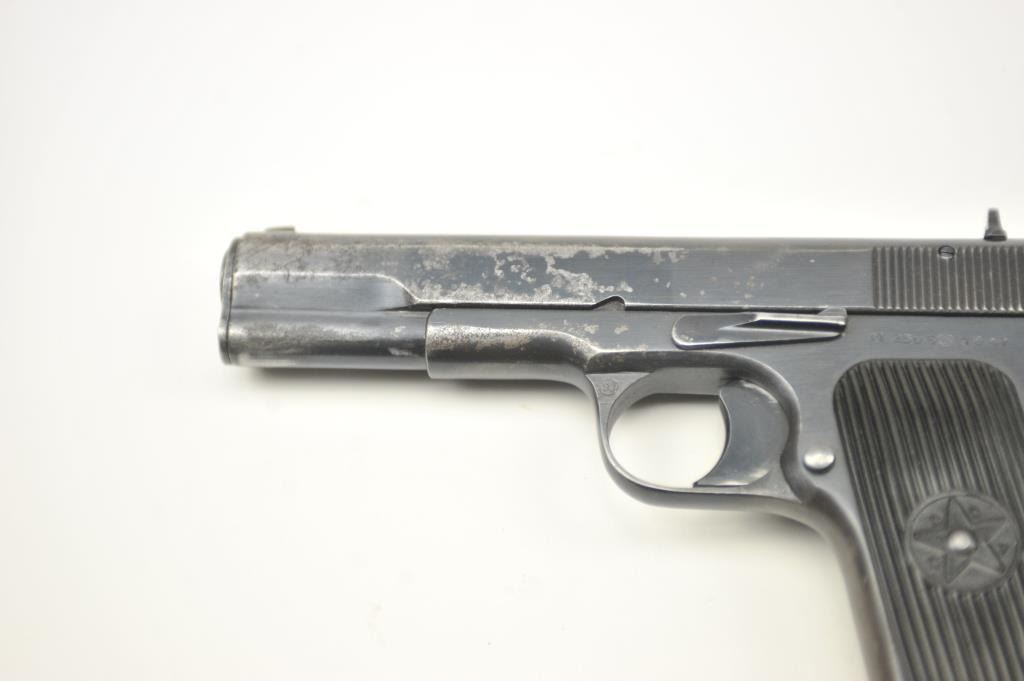Tokarev Semi-Auto Pistol in 7.62 Tokarev caliber with military markings and numbered “PT2305” with Russian proof and date 1947. 50%-70% military blue with corrosion, cleaning and loss towards front of the slidemostly left side. Good mechanically with very good bore. Holster, extra mag and cleaning rod included. Matching mag. No import marks. (C&R/PPT) Est.: $400-$800