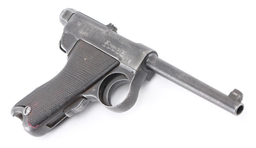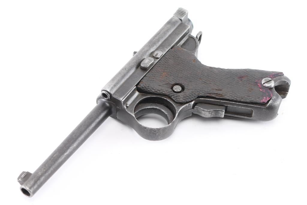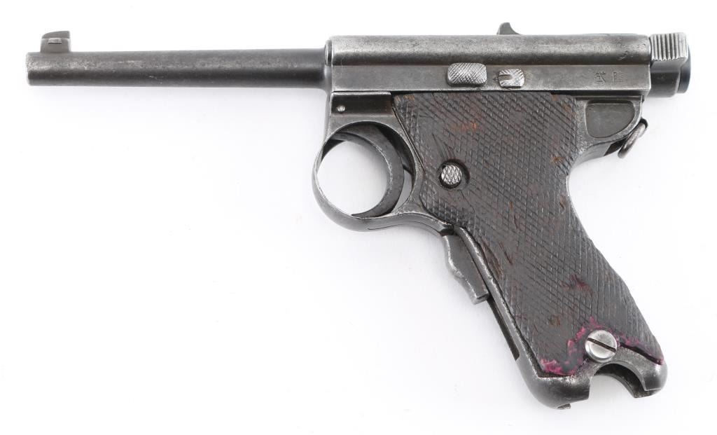 This is a Papa Nambu pistol that has been arsenal reworked, re-numbered by the Chinese military. Used by Chang Tso-lin's warlord army and by the National Revolutionary Army. Original number over stamped with "67161" bolt and rear of cocking piece numbered "5806" Standard Japanese markings, with a Chinese stamped "14": and Chinese symbols etched on the right receiver. Safety lever added to the left frame, magazine release button is stationary (??). Bore is very good, dull blue finish is about 60% with handling/edge wear, minor scattered pin-prick pitting with heavier pitting on the trigger, back strap, & around the lanyard loop. Right grip is loose, no magazine, repair to bottom of the left grip panel. Rare. NRA Condition-Fair. C&R Firearm.