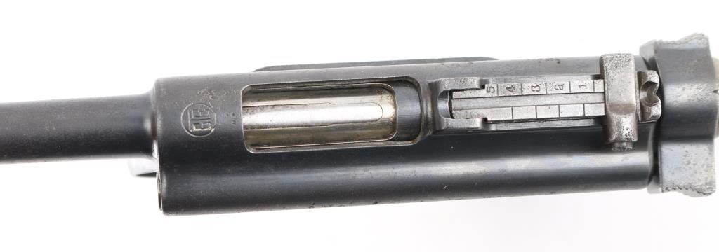 SN: 1398. Rare variant GTE pistol with Tokyo arsenal symbol on the left frame. Back strap slotted for shoulder stock. Early production Tokyo Gas & Electric Japanese Papa Nambu Semi-Automatic Pistol Produced by the Tokyo Gas and Electric Company under Military contract with the "GTE" marking on the chamber, one piece frame with model markings and serial number, and a pair of Kanji markings on the left side. Korean markings etched on right frame. Fixed front and tangent rear sights, serrated cocking knob, grip safety on the front strap, lanyard swivel, and checkered contoured grips. 4 3/4" round barrel. Matching serial numbers on frame & backside of cocking piece, backside of right grip panel,and the bolt. Magazine numbered '1388". Bore has worn rifling with scattered light pitting, grips are very good, blue finish has faded to dull, about 75% with small areas of light scattered pin-prick pitting, deeper pitting on the straps with finish loss. One piece frame. This obscure variant has been the subject of some mystery for many years among collectors but has since been categorized and described by Derby & Brown as the “First Variation Tokyo Arsenal Contract”. It is noted as a rare variant with frame without rear milled side panels, stock slot either present or filled (Present on this example), Tokyo Arsenal symbol, and serial number range 700-2816. An interesting example for the dedicated Nambu collector. NRA Condition-Good. C&R Firearm.