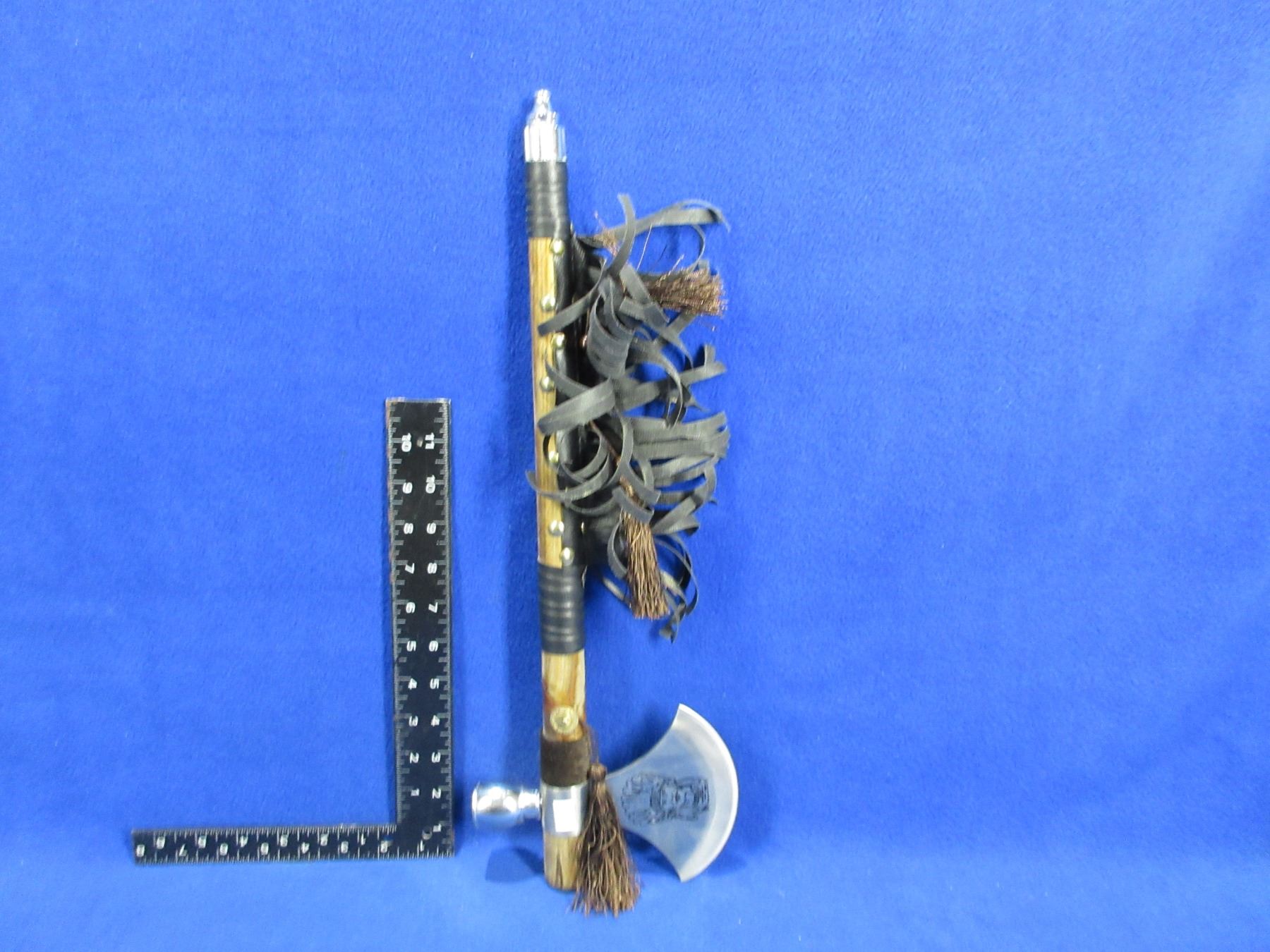 Tomahawk Peace Pipe - Curved fixed blade, wood handle, faux leather tassels, stainless steel mouthpiece and pipe bowl, 19" long,