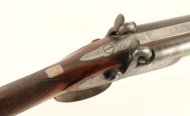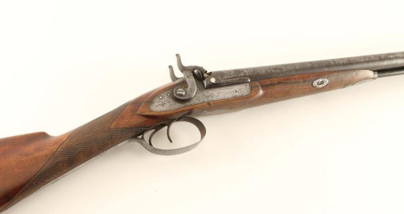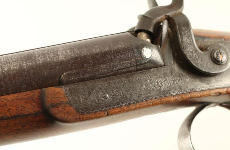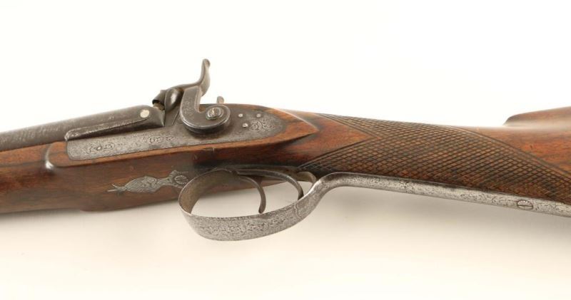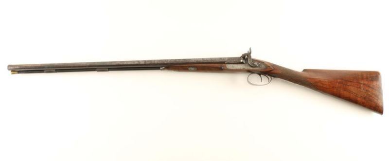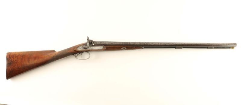Antique English made muzzle loading double barrel shotgun with an approximate 16 gauge bore. 28" damascus bbls, double triggers, light coverage floral scroll engraving, exposed hammers, wood ram rod, and one-piece straight grip shoulder stock with checkered wrist & metal buttplate. Well crafted. Barrels display an aged brown patina with some damascus patterns still visible. The lock plates exhibit a mostly light silver appearance. Action performs well & wood stock is very good. Condition is good to very good. ***Antique Firearm***