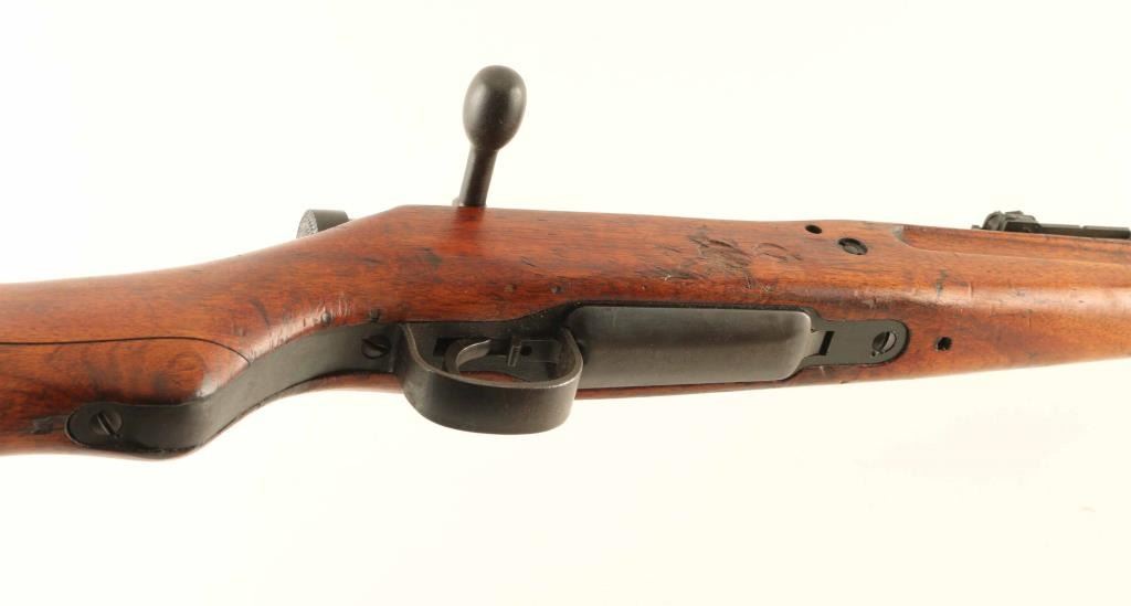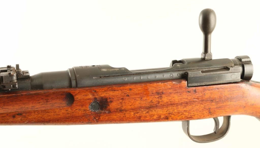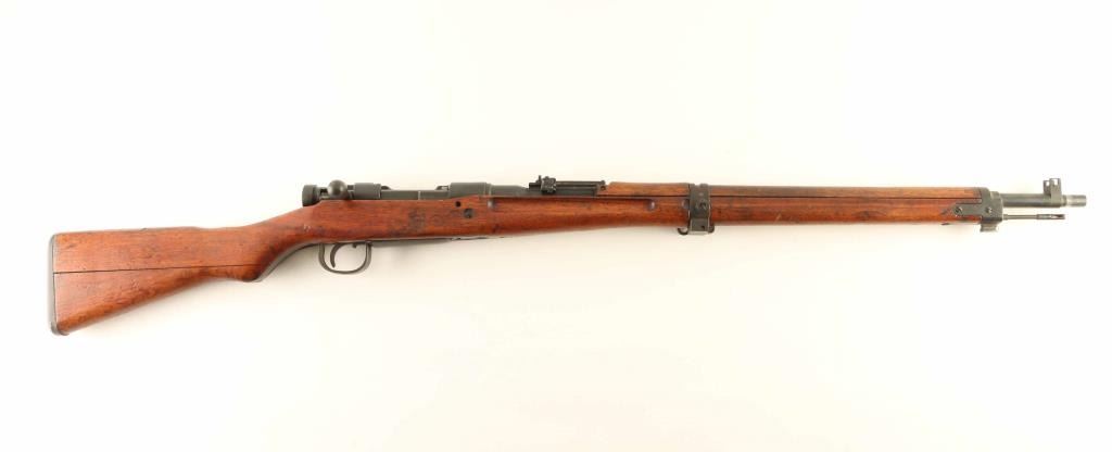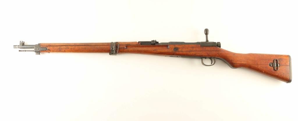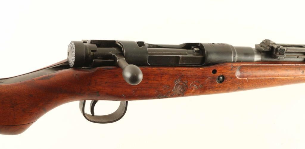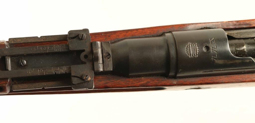 SN: 71297 'Thirty-First Series' Struck-thru Chrysanthemum. Japanese military bolt action rifle. Features 25.5" barrel, cleaning rod, bayonet lug, blade front sight with protector ears, peep rear sight with elevation ladder & anti-aircraft wings, hinged floorplate, manual safety, side mounted sling swivels, straight bolt handle. Rear band has provision for monopod, no monopod installed. Mum is defaced with two parallel chisel strikes. Bore is very good condition, appears to be hard chrome plated. Retains 85% blued finish, turning brown at bands and rear sight, bare metal on sharp corners, muzzle, moving parts. Screw slots are lightly marred. Wood is good to very good condition, appears original finish, with dings & dents. Butt join shows slight gap all along its length. Bolt numbered "297" on all four major parts. Condition is NRA Good++ *** C&R Firearm ***
