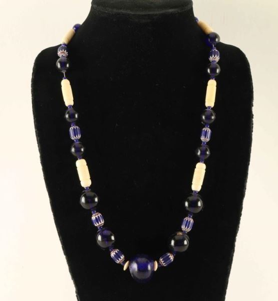 Dark blue and white beads with red, white and blue trade beads. Measures 25" long.