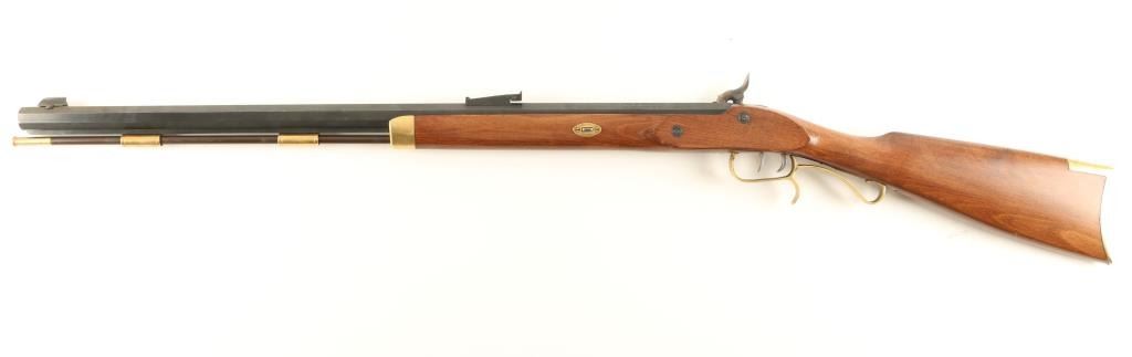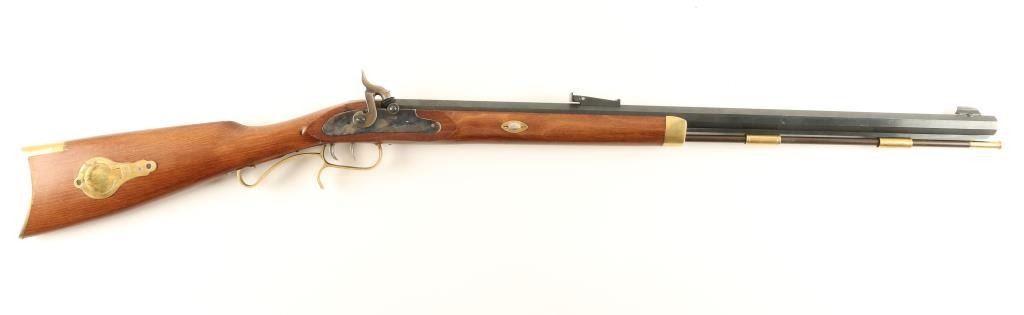 Modern production Spanish made .50 caliber percussion rifle in classic Hawken style. Features a blued 28" octagonal barrel, blade front sight, adjustable rear sight, double set trigger, Delrin ram rod, brass furniture, case hardened lock, finger rest trigger guard, patch box, serrated hammer spur, and full-length select hardwood straight grip shoulder stock. Rifle retains approximately 93% original blued finish with some blemishes on barrel. Action is crisp, bore is clear and wood stock is good showing a crack on the opposite side of the lock & another at the wrist. Condition is very good. ***Antique Firearm***