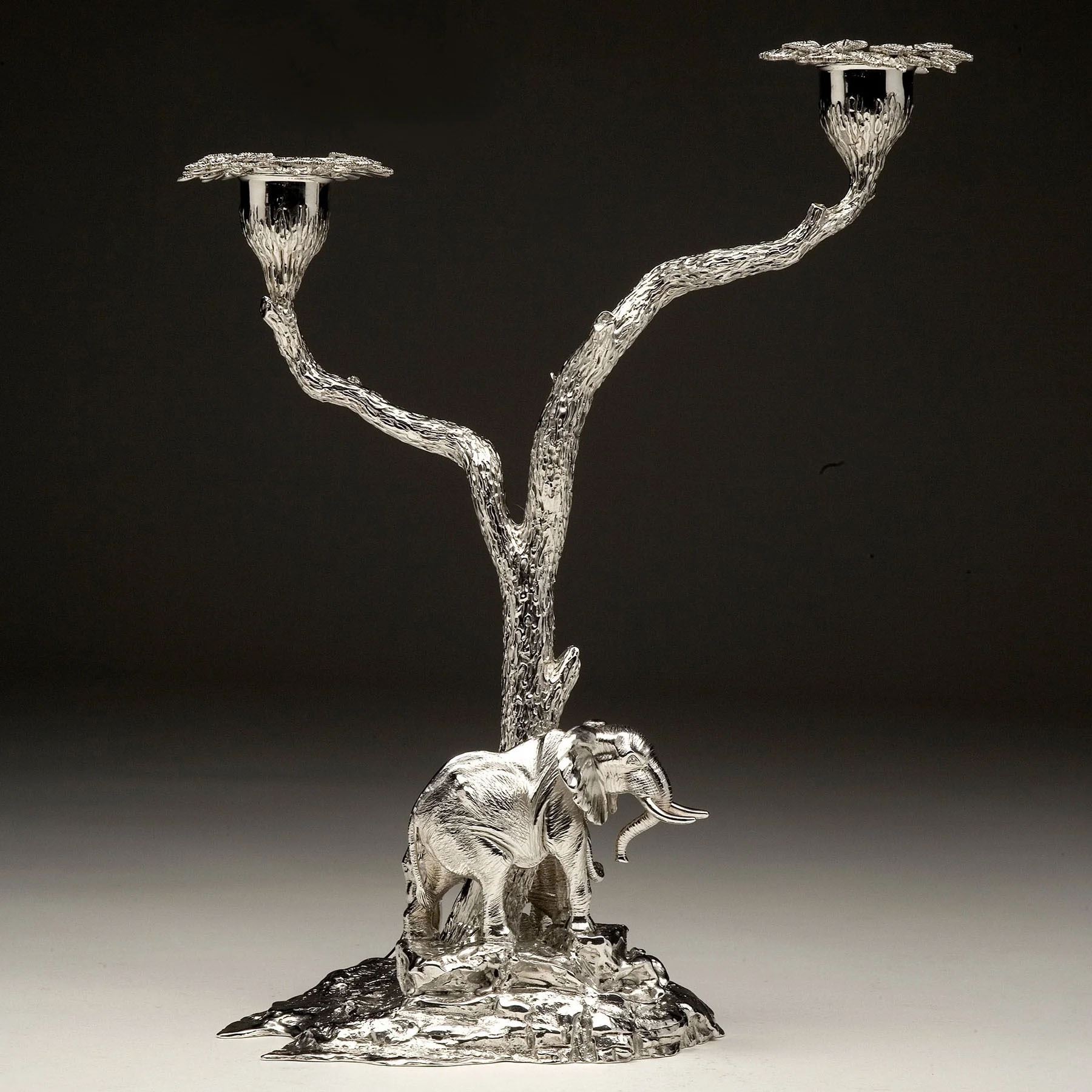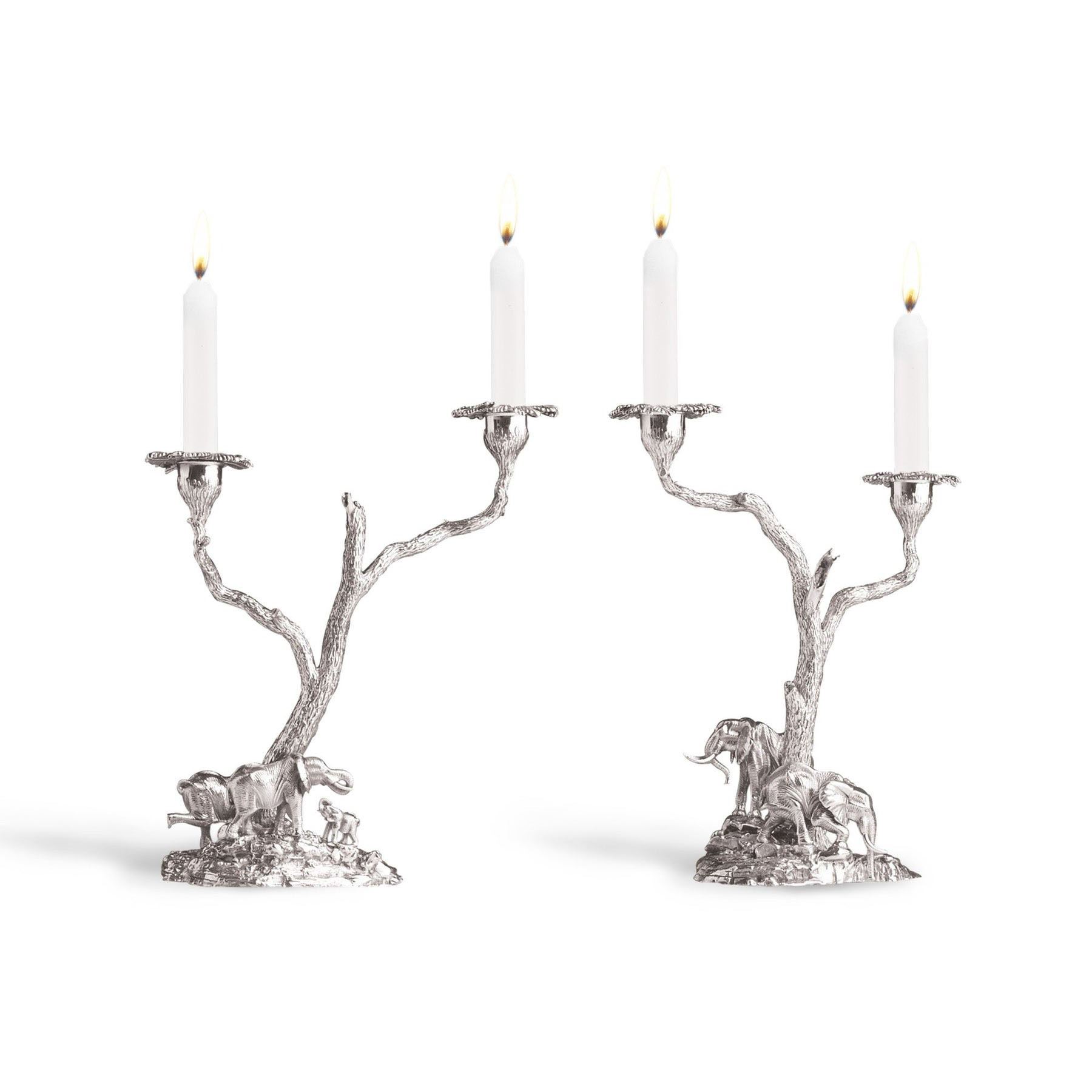 Elephant & Mopane Tree Candelabra Pair In Silver - Patrick Mavros