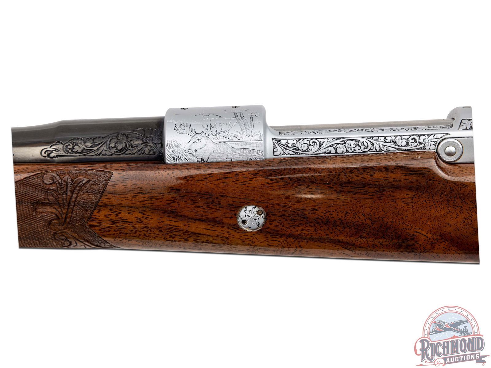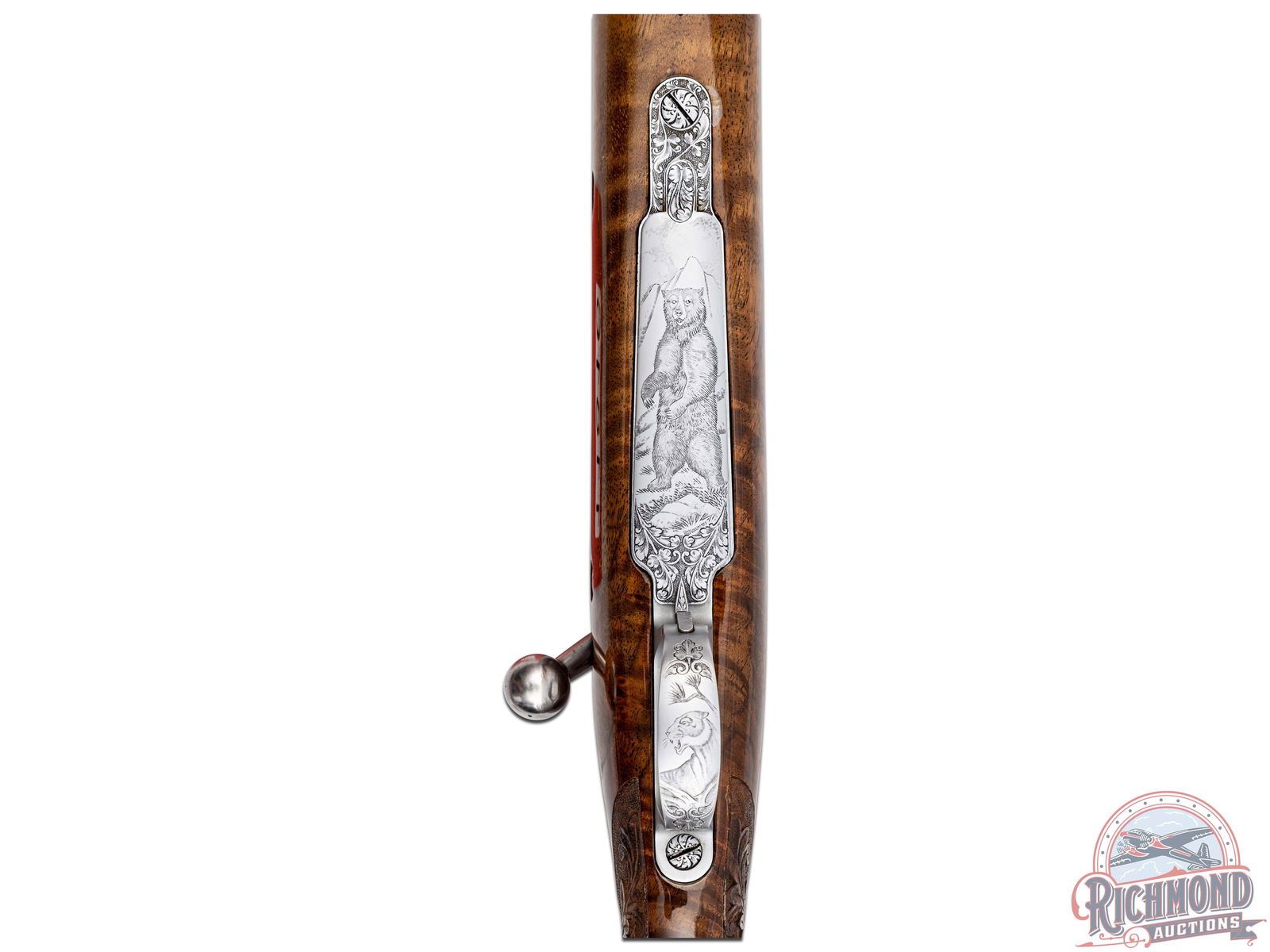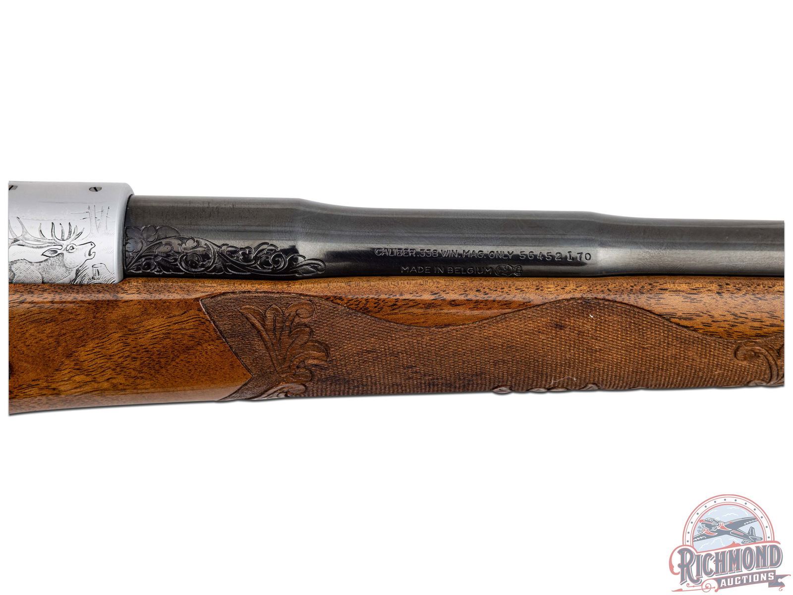 Manufactured in 1970 in Belgium by FN for Browning. Standard markings and proofs on the barrel, frame and bolt. 24" blued steel barrel. Stock, bolt and receiver serial numbers match. Factory drilled for a scope mount. Gray finished receiver with engraved elk on the right side of the chamber and moose on the left, signed by master engraver Louis Acampo. The floor plate has a standing grizzly bear and signed by master engraver Richard Kowalski. Typical scroll work on the balance of the receiver and on the chamber area of the barrel. Trigger guard features an engraved mountain lion and signed "GC", by master engraver Gino Cargnel. Gold washed trigger. Factory high gloss finished walnut stock with two cross bolts. Fine cut checkering on the wrist and forearm. Both are outlined with floral carving. Factory sling studs. Typical capped pistol grip. Browning brown rubber butt pad. LOP: 13-1/4". CALIBER: 338 Win Mag . S/N: 56452L70. FFL STATUS: Curio & Relic.