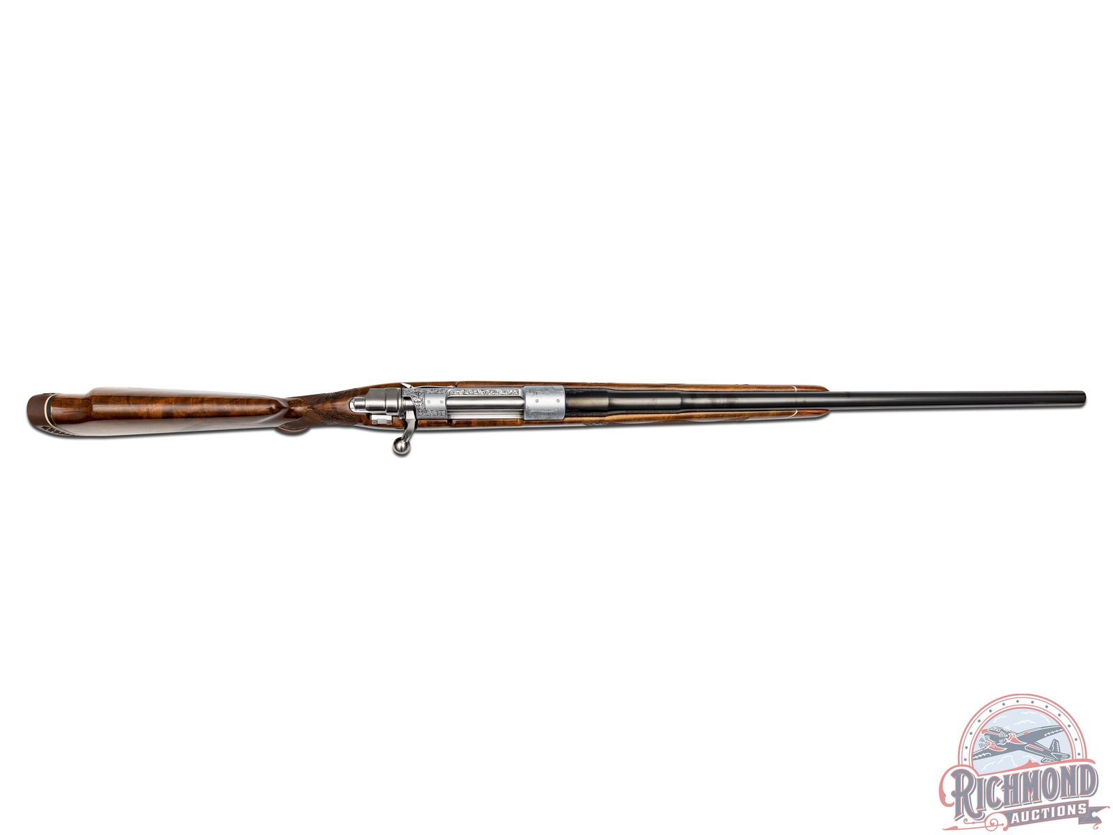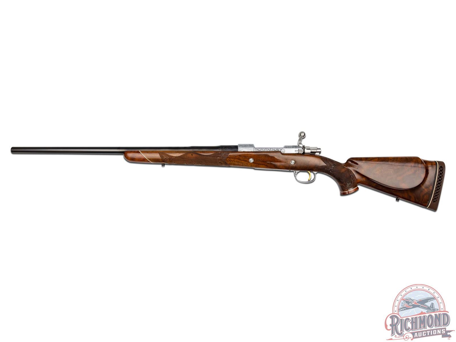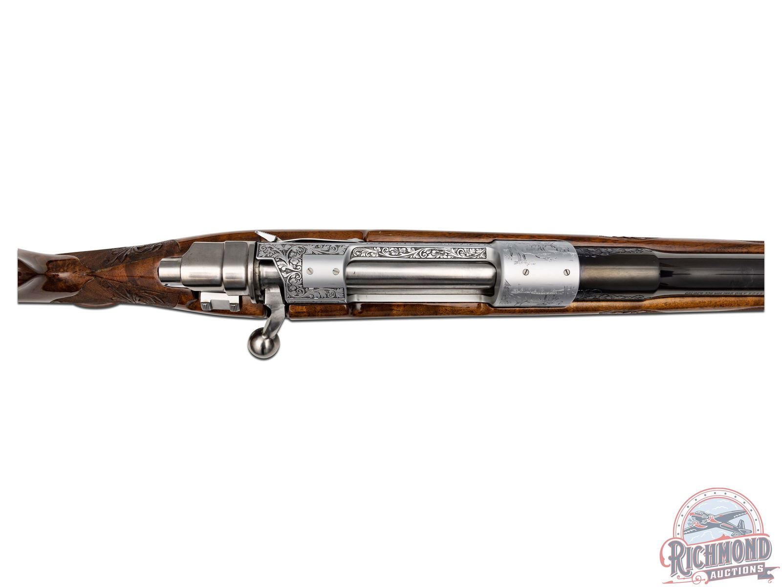 Manufactured in 1970 in Belgium by FN for Browning. Standard markings and proofs on the barrel, frame and bolt. 24" blued steel barrel. Stock, bolt and receiver serial numbers match. Factory drilled for a scope mount. Gray finished receiver with engraved elk on the right side of the chamber and moose on the left, signed by master engraver Louis Acampo. The floor plate has a standing grizzly bear and signed by master engraver Richard Kowalski. Typical scroll work on the balance of the receiver and on the chamber area of the barrel. Trigger guard features an engraved mountain lion and signed "GC", by master engraver Gino Cargnel. Gold washed trigger. Factory high gloss finished walnut stock with two cross bolts. Fine cut checkering on the wrist and forearm. Both are outlined with floral carving. Factory sling studs. Typical capped pistol grip. Browning brown rubber butt pad. LOP: 13-1/4". CALIBER: 338 Win Mag . S/N: 56452L70. FFL STATUS: Curio & Relic.