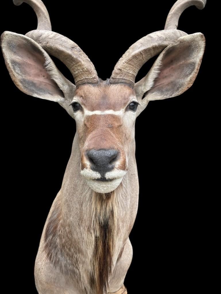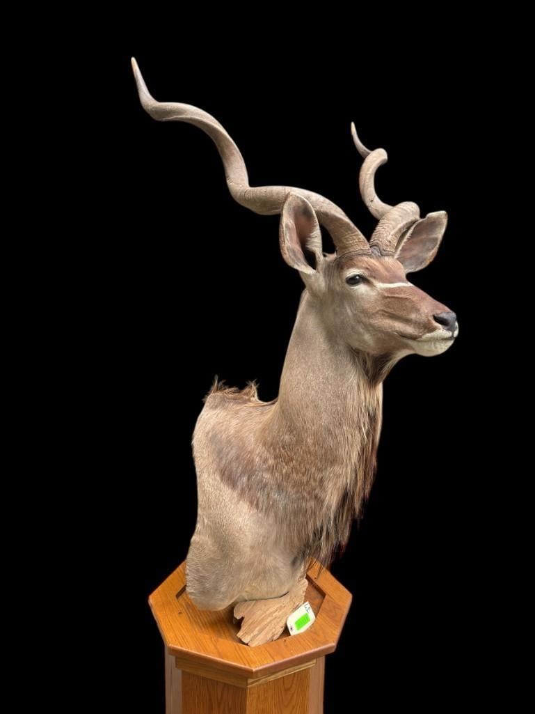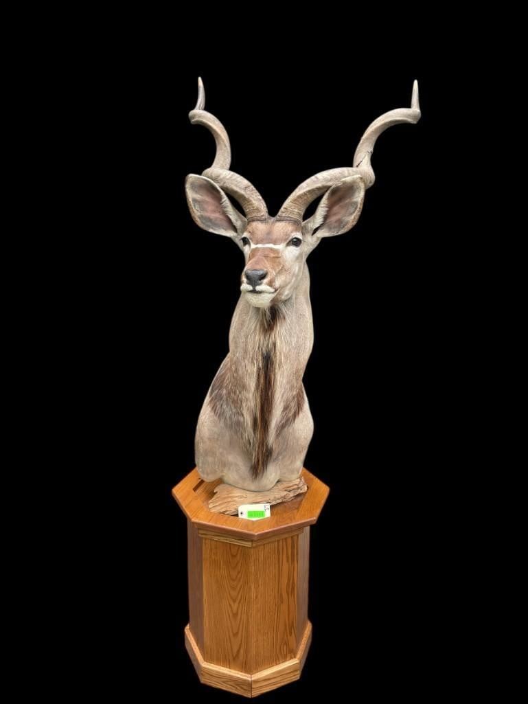 Trophy Sized AFRICAN KUDU Pedestal Mount with an Oak Base. He has a 33" Spread and the Horns measure 47" Long around the Spiral Ridge (each). He is mounted on a beautiful octagon shaped Oak Pedestal. TAXIDERMY