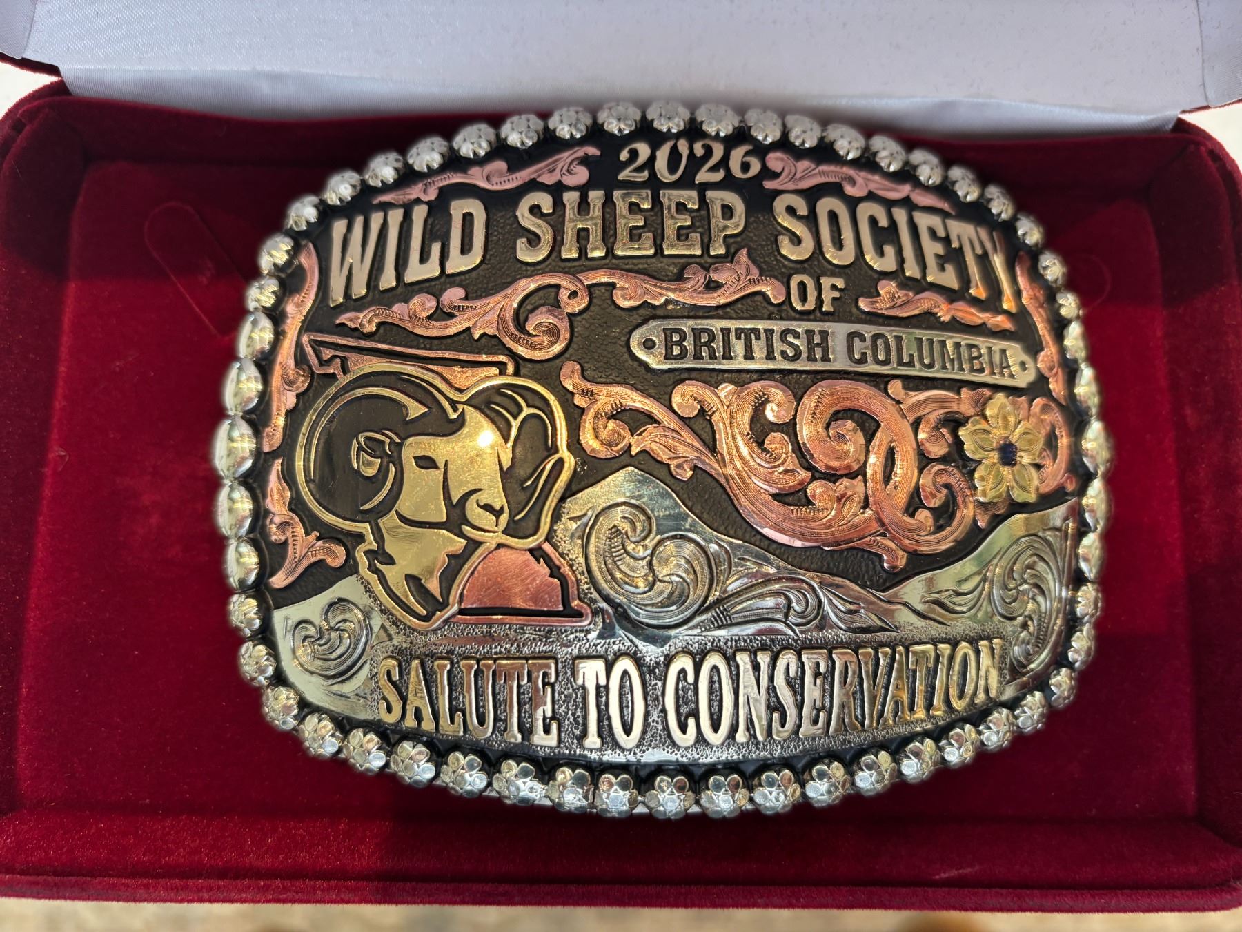 A custom WSSBC belt. Full mountain scene hand carved design, with a Stone sheep euro skull. Two-tone coloured. Completely hand drawn, carved and made here in Northern B.C. Generously donated by long time supporter and WSSBC Conservation Partner Frontiersmen Gear
