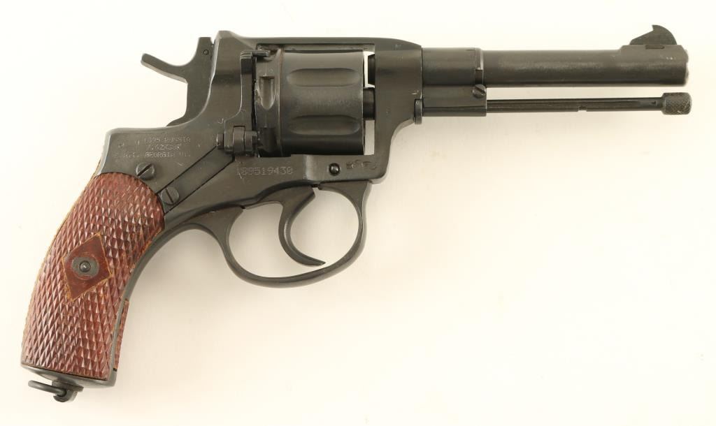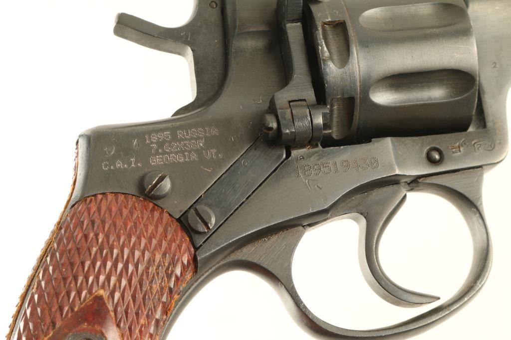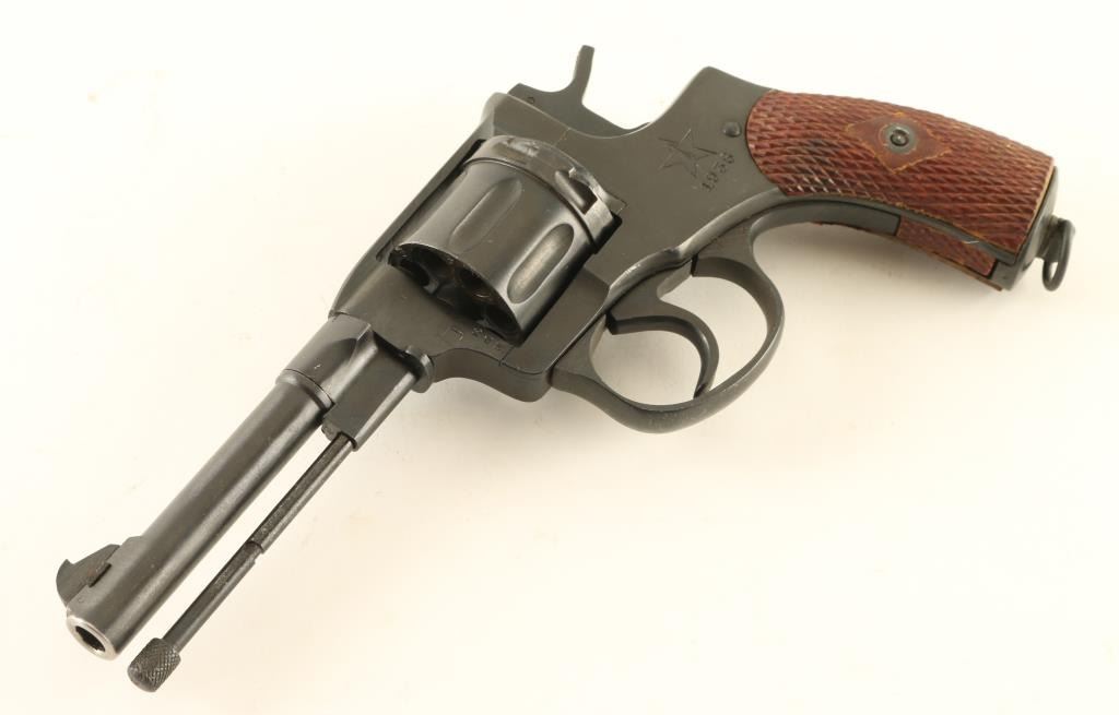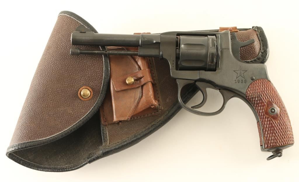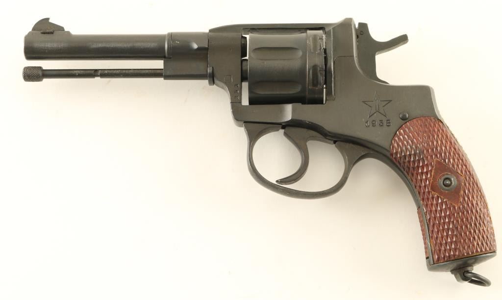 Russian military "gas seal" revolver imported by CAI, Georgia VT. Dated 1938. Features blued finish, brown plastic checkered grips, 4.4" barrel, fixed sights, double/single action, lanyard ring at butt. Bore and chambers are very good condition. Retains 90% dark blued finish, possibly arsenal reworked, with bright metal ring at muzzle., Grips are good condition with rubbing or other wear at high spots. Action operates properly with tight lock-up. Includes brown leatherette full flap holster, cleaning rod, lanyard, screwdriver. Condition is NRA Excellent (possible arsenal rework) *** C&R Firearm ***