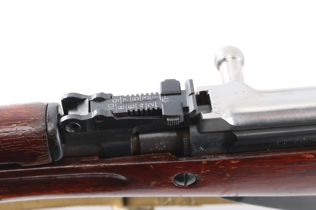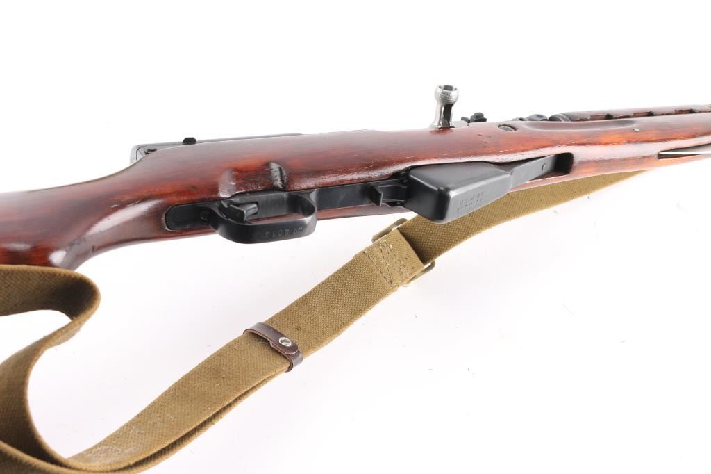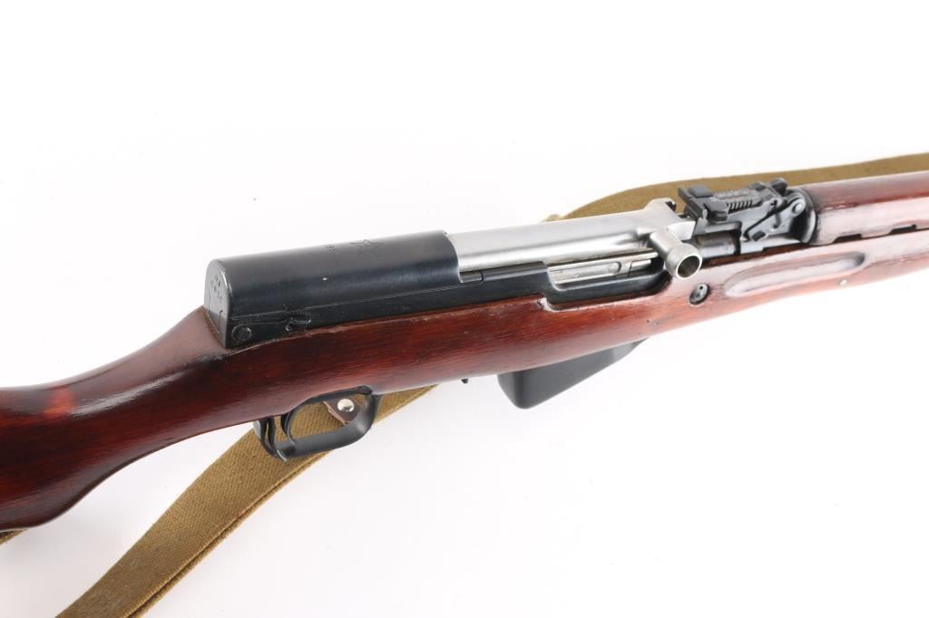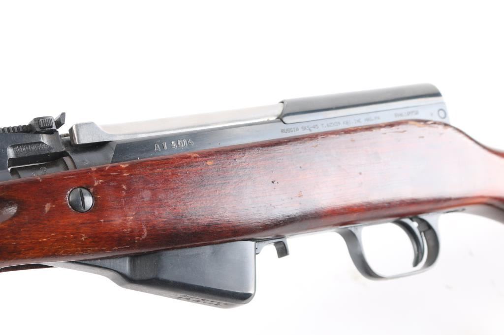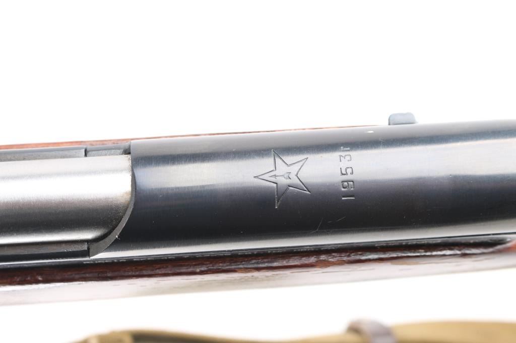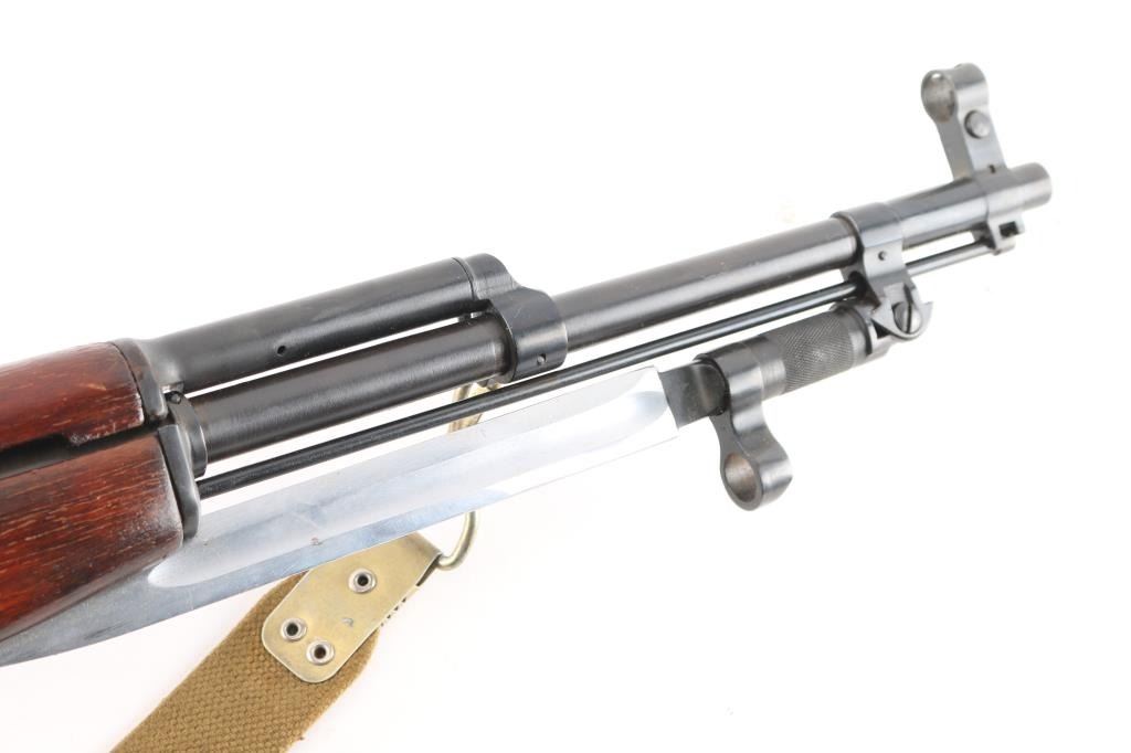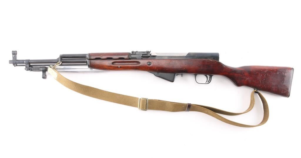 Russian (Soviet Union, made 1953) semiautomatic rifle imported by KBI, Harrisburg PA. Features 20" hard chrome lined barrel, protected post front and tangent rear sights, cleaning rod and folding blade bayonet under barrel, fixed 10 round magazine with hinged floorplate, manual safety, hardwood stock with trap in butt for cleaning kit, sling swivels. Bore is excellent, bright Metal retains about 95% blued finish (possible arsenal reblue) with minor scratches. Bayonet blade, bolt & carrier are dull silver (appears hard chromed). Stock is very good condition with minor scratches. Observed numbers match original Russian serial number, importer has added their serial number to left rear of receiver. Includes KBI cardboard box & good condition green web sling.