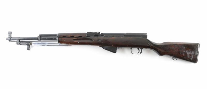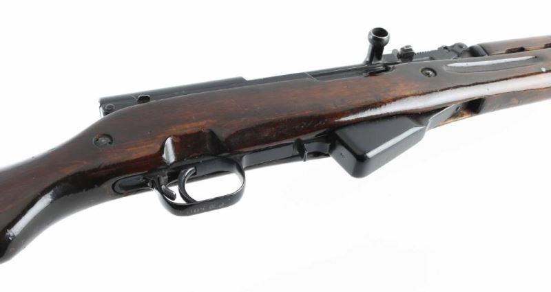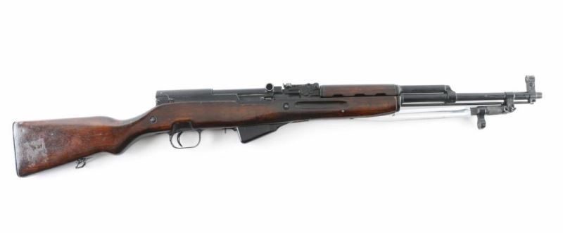 Russian (Soviet Union, made circa 1953) semiautomatic rifle imported by NHM, Sacramento CA. Features 20" hard chrome lined barrel, protected post front and tangent rear sights, cleaning rod and folding blade bayonet under barrel, fixed 10 round magazine with hinged floorplate, manual safety, hardwood stock with trap in butt for cleaning kit, sling swivels. Bore is very good condition. Metal retains 80% dark black color finish revealing gray color underneath, with scrapes and scuffs, bare metal showing on sharp edges and where handled. Bayonet blade is bright polished bare metal. Stock is good serviceable condition, showing tape residue, scuffs & dents, chipping of dark colored varnish finish. Observed numbers match original Russian serial number, importer has added their serial number to left rear of receiver. Cleaning kit in butt trap. Condition is NRA Very Good *** C&R Firearm ***