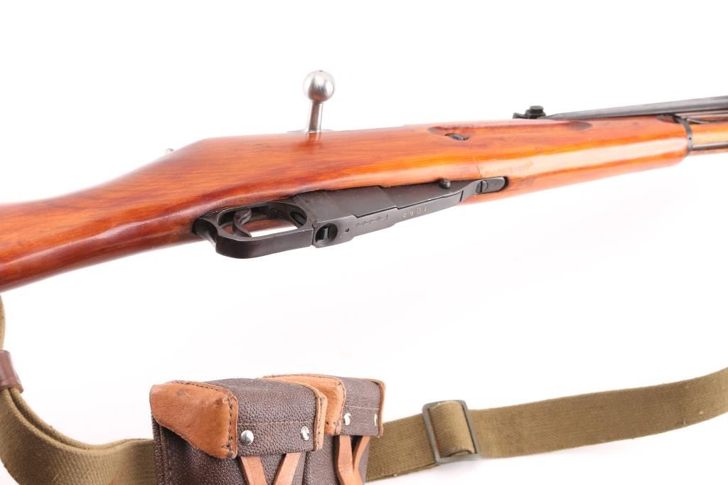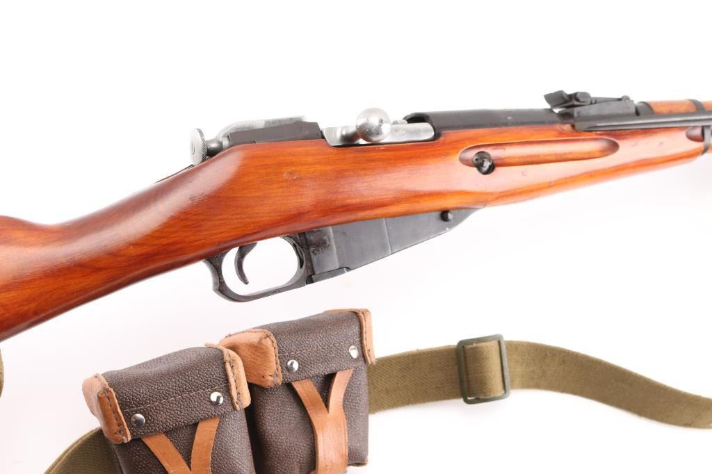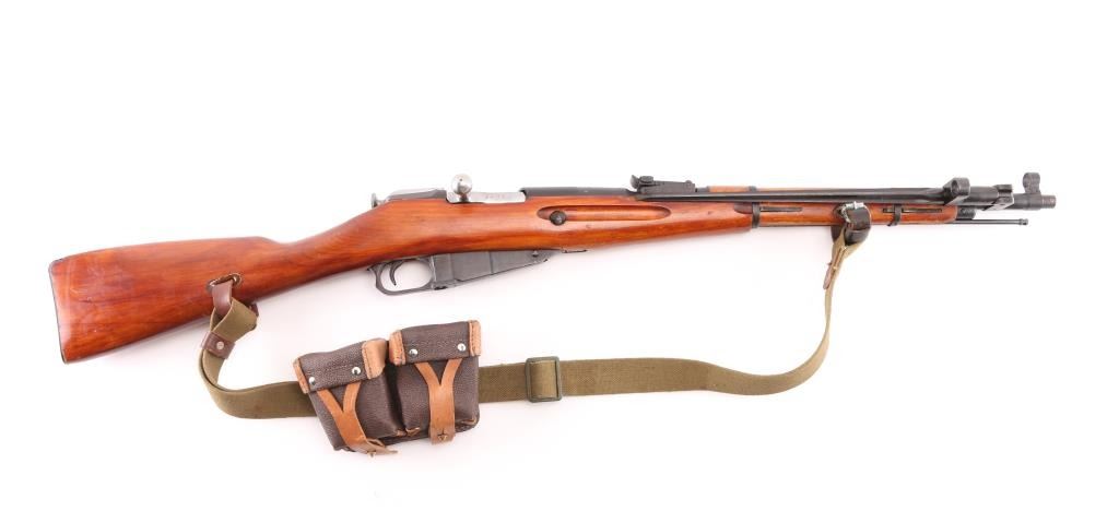 Russian (Soviet Union) military bolt action rifle imported by R Guns, Carpentersville IL. Dated 1944. Features 20" barrel, hooded post front & tangent rear sight, folding spike bayonet, manual safety, cleaning rod, sling slots. Bore is fair to good condition, dark grooves, slightly pitted, strong rifling. Retains 85% dark blued finish with handling marks. Bare metal bolt is clean polished condition. Varnished hardwood stock & handguard are very good condition with scrapes, dings. Appears arsenal refinished. Original serial number matching where observed (previous number struck thru on floorplate), importer applied number on left side of receiver. Includes very good condition canvas web sling with leather "dog collars", twin compartment ammo pouch, oil bottle, maintenance tool. Condition is NRA Very Good as arsenal refurbished *** C&R Firearm ***