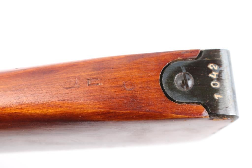 GOOD: Some minor replacement parts; metal smoothly rusted or lightly pitted in places, cleaned or re-blued; principal letters, numerals and design on metal legible; wood refinished, scratched bruised or minor cracks repaired; in good working order.